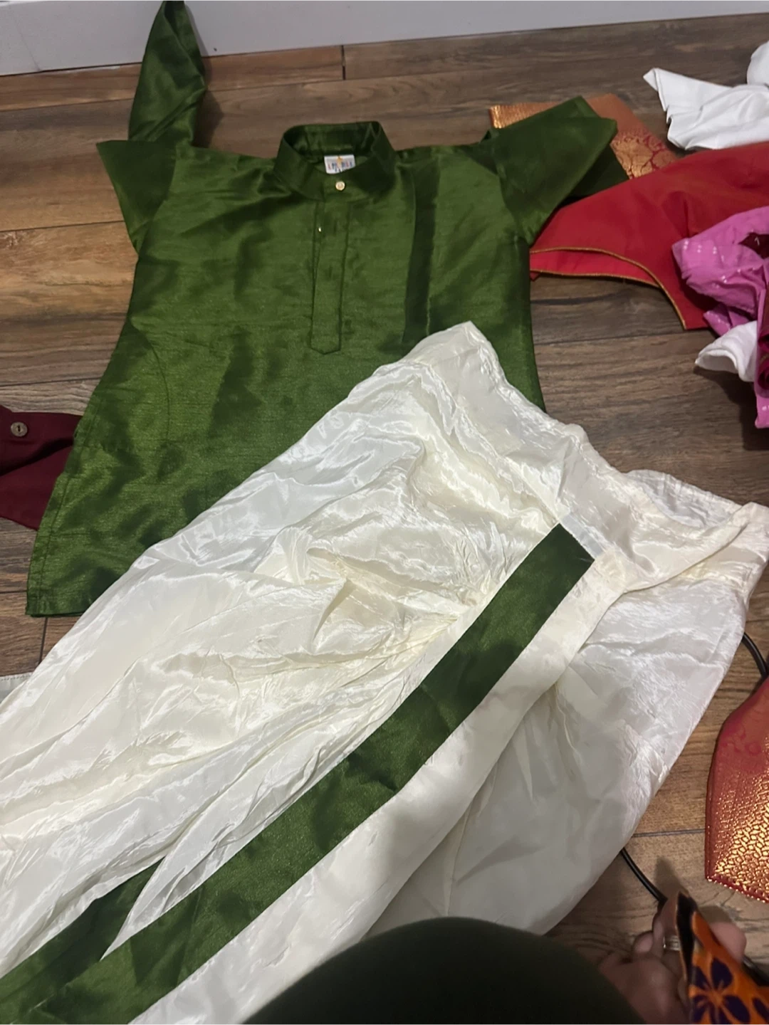 This is a festive kids' kurta and dhoti set in green and cream. The kurta has a mandarin collar and button closure. The dhoti pants are cream-coloured with a green border. It's perfect for cultural events or celebrations!