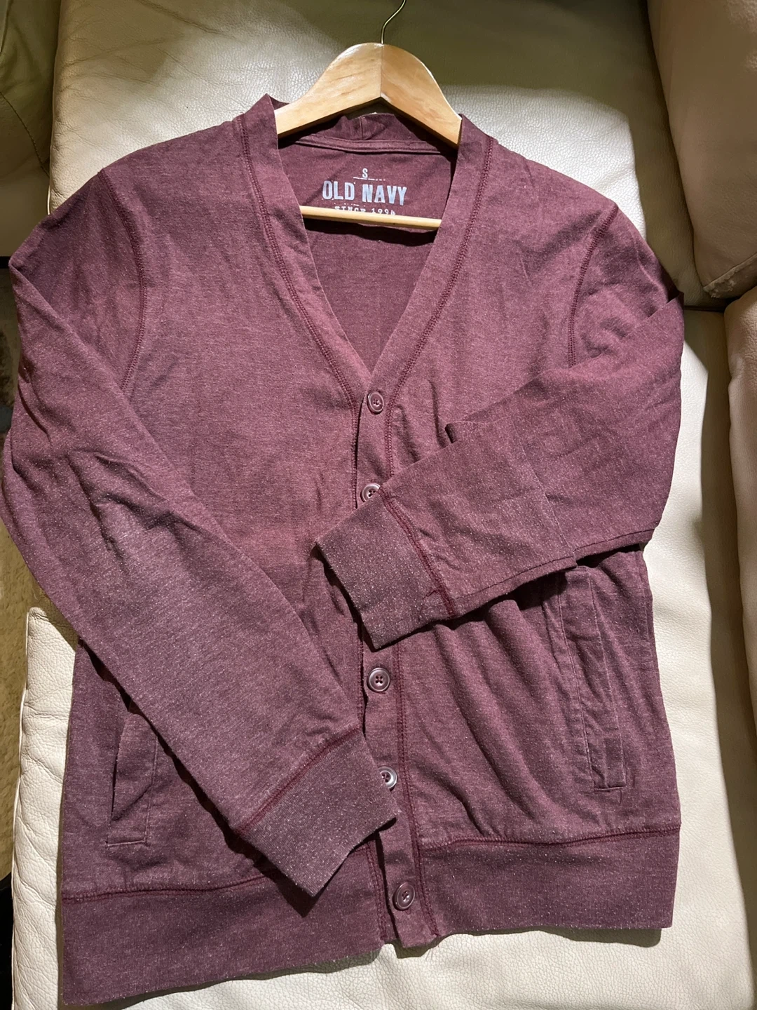 Old Navy burgundy cardigan sweater in size small. It's a classic v-neck style with button closures and two front pockets. This sweater is great for layering during cooler weather!