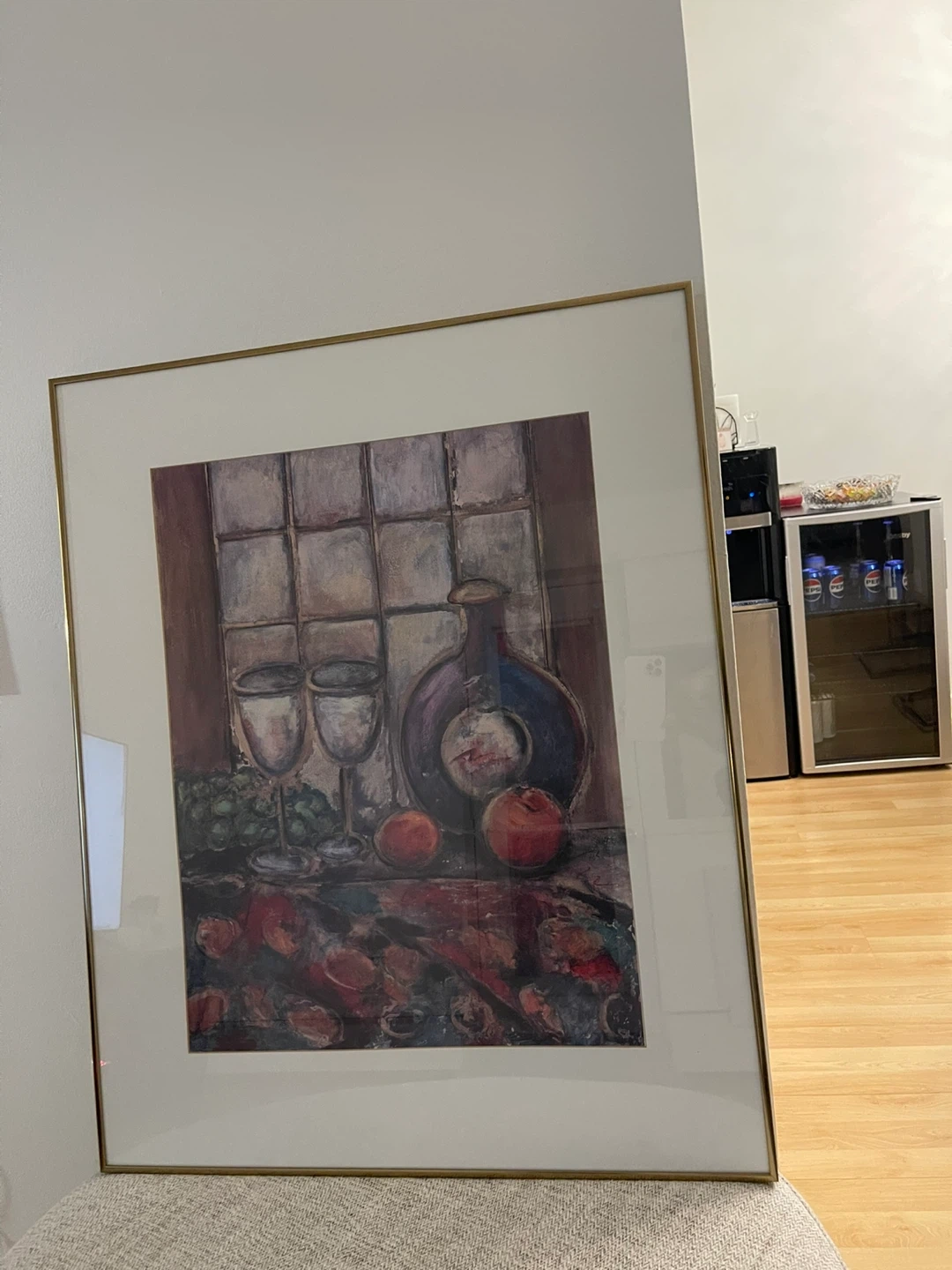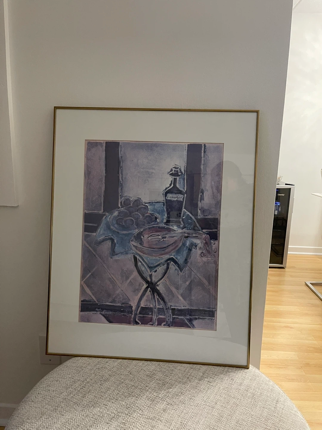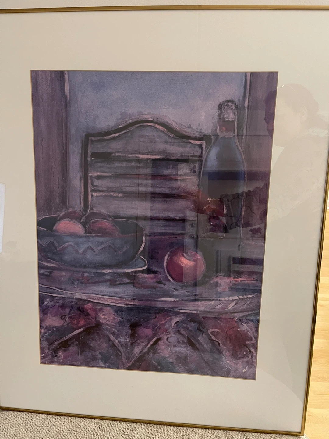 Framed still life print featuring a bottle and fruit. It's presented in a classic style that complements various decor. This piece adds an artistic touch to any room. size 26 by 32 inch . price $20 each .