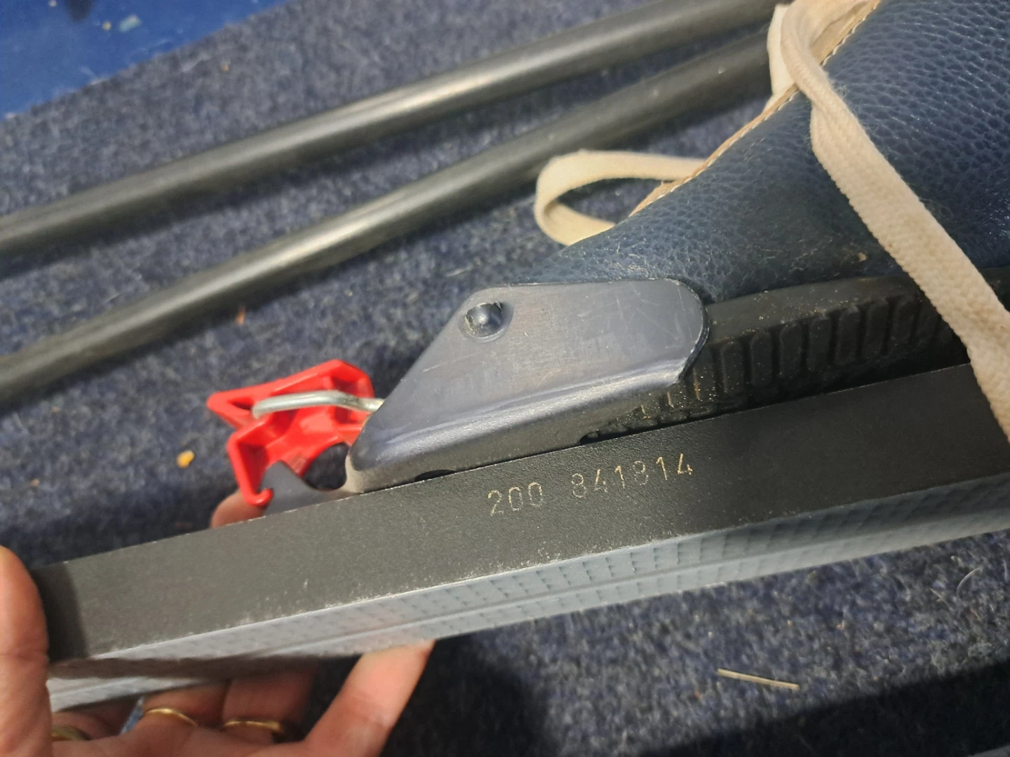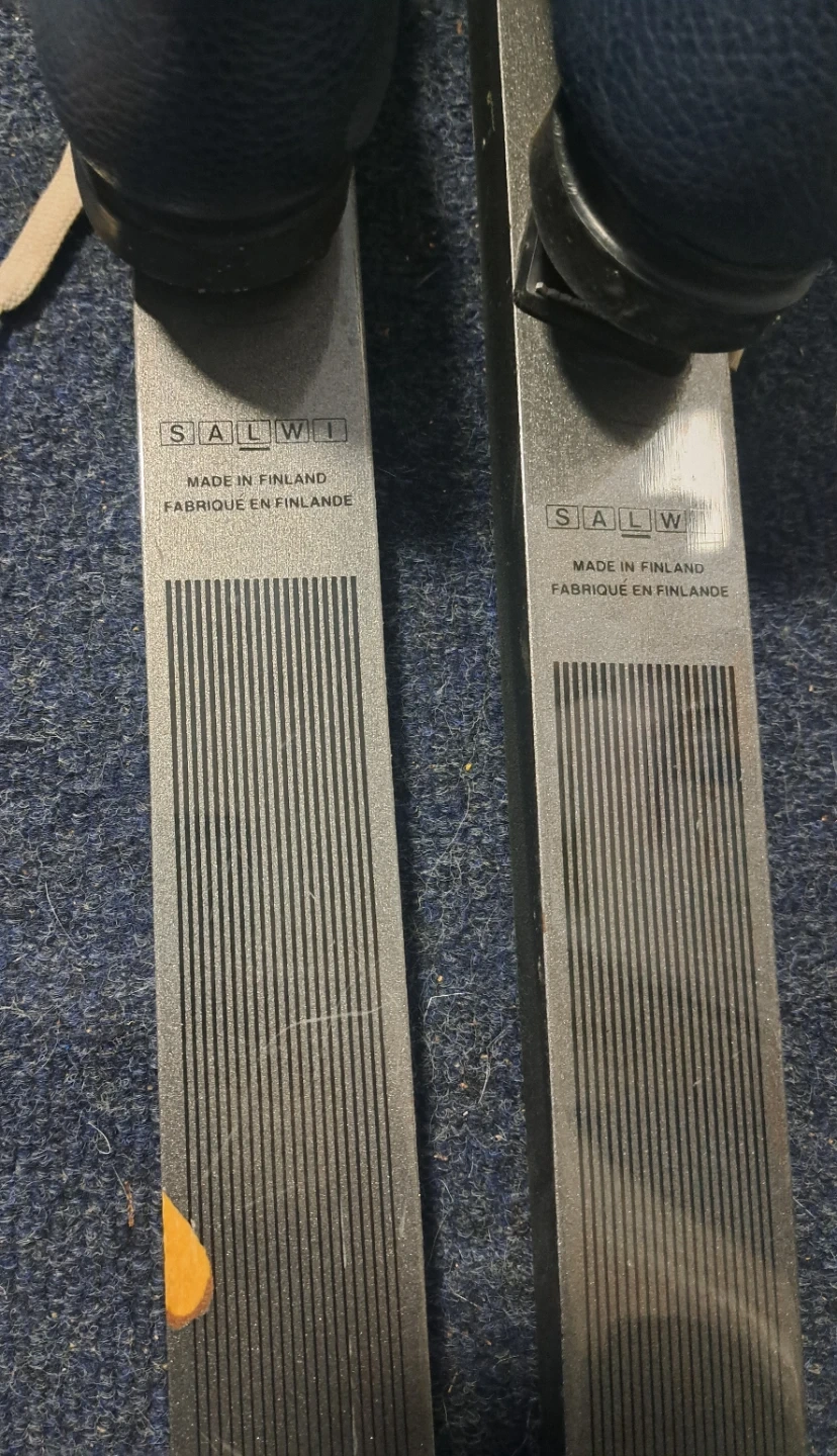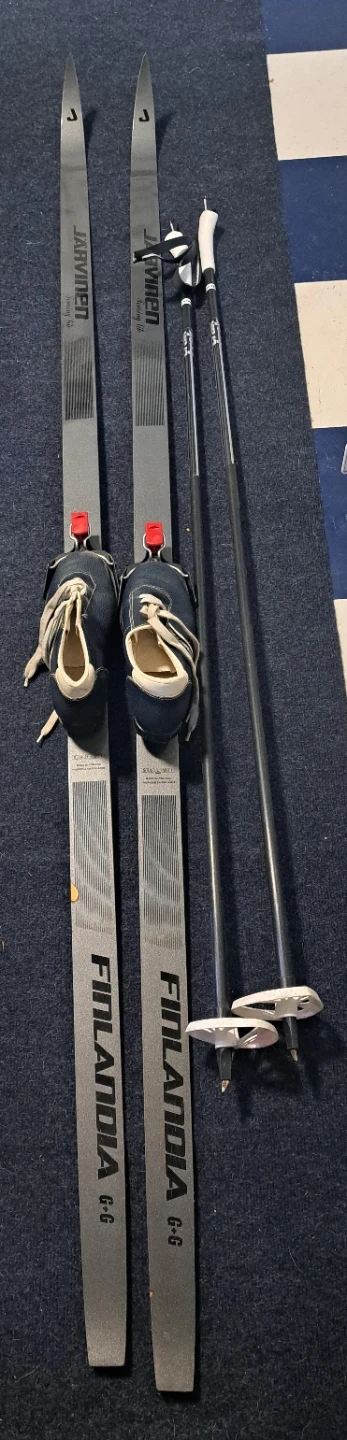 Salva Finlandia G-G cross-country skis 200cm, poles 135cm & women's boots sz 8. Made in Finland. Set includes bindings. There is a chip on the top of one ski - see photo.