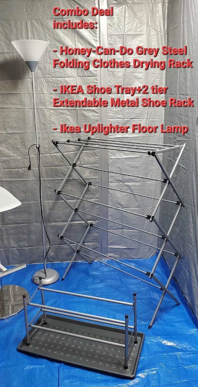 This combo deal includes a Honey-Can-Do grey steel folding clothes drying rack, an IKEA shoe tray and 2-tier extendable metal shoe rack, and an Ikea uplighter floor lamp, all in used but good condition, perfect for organizing your home. The items show some signs of use but are fully functional and ready to help you maximize your space. Here are some details about each item: