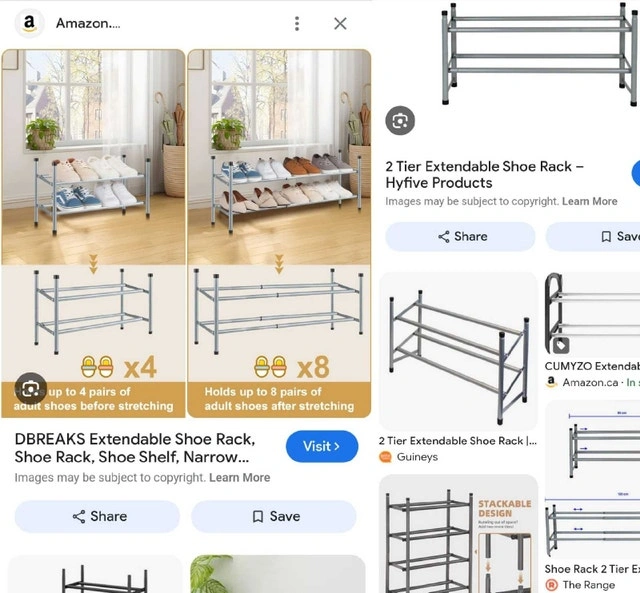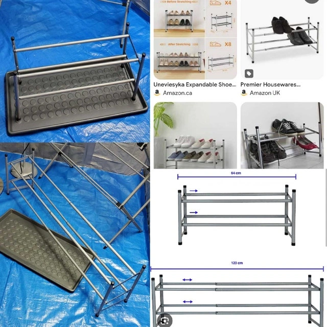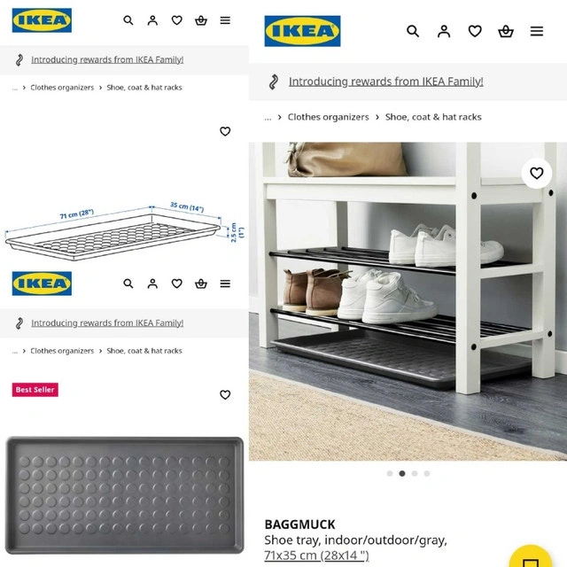 * **IKEA Shoe Tray and Rack:** Includes a BAGG MUCK shoe tray (71x35 cm) and a two-tier extendable metal shoe rack, adjustable to fit various shoe sizes.