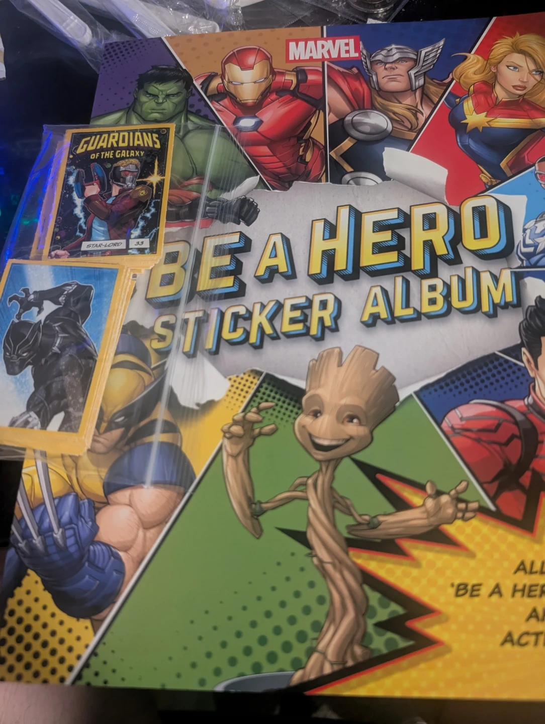 This Marvel Be a Hero sticker album features characters like Star-Lord and Wolverine. It's a fun way to collect and organize stickers. This album is great for young Marvel fans! Comes with all 64 stickers.