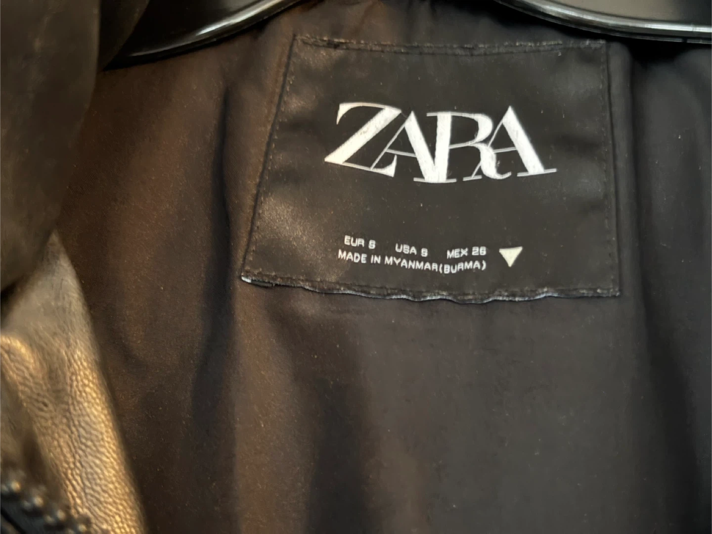 This black puffer jacket is made of faux leather. It's a cropped style with a high collar and snap closures over the zipper. The cuffs are elasticized. It's a size EUR S.