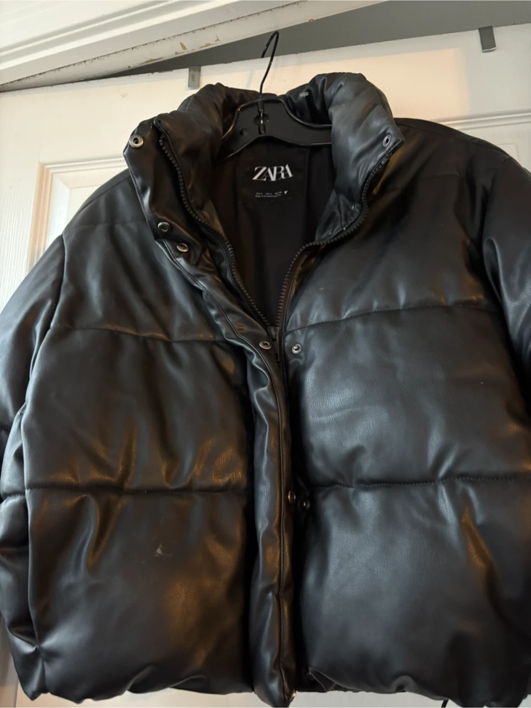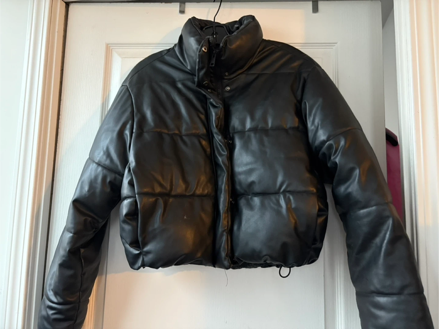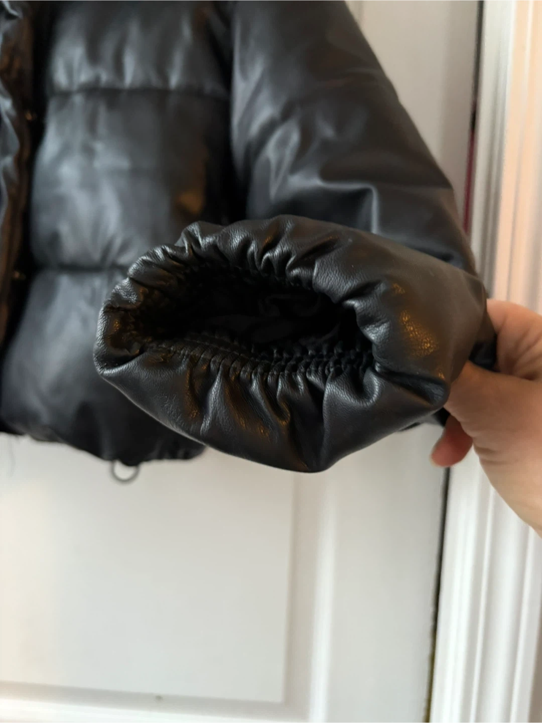 This black puffer jacket is made of faux leather. It's a cropped style with a high collar and snap closures over the zipper. The cuffs are elasticized. It's a size EUR S.