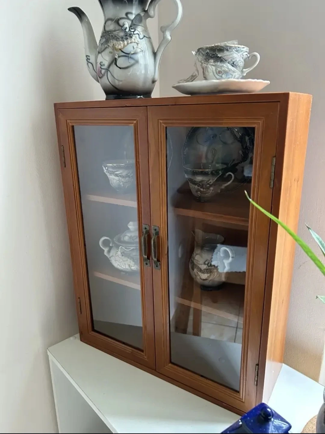 This charming wooden cabinet features two glass doors for displaying your favourite items. It has a compact size, perfect for tabletops or shelves. Measures 36.5cm wide, 45.6cm tall, and 13.4cm deep.