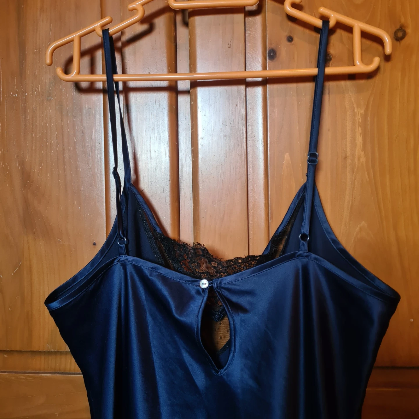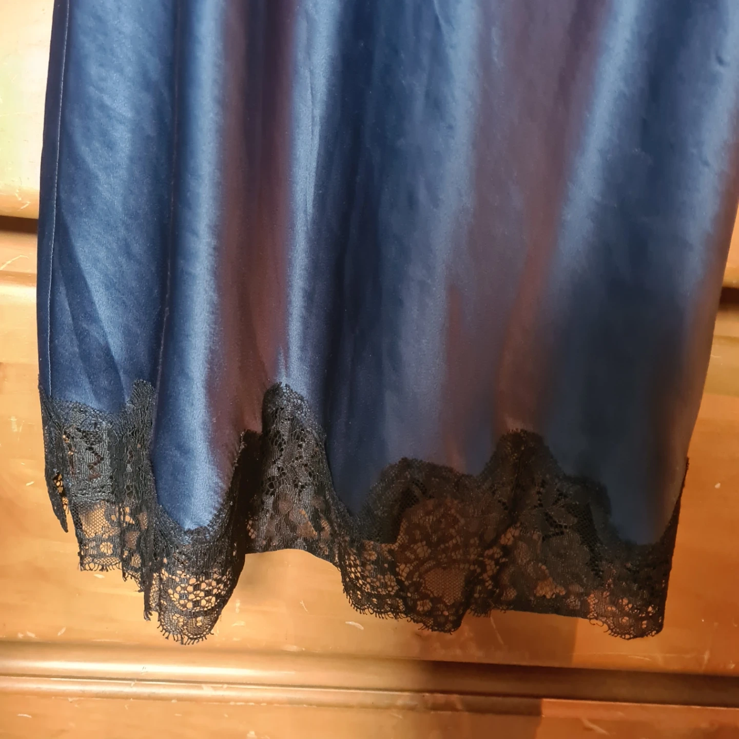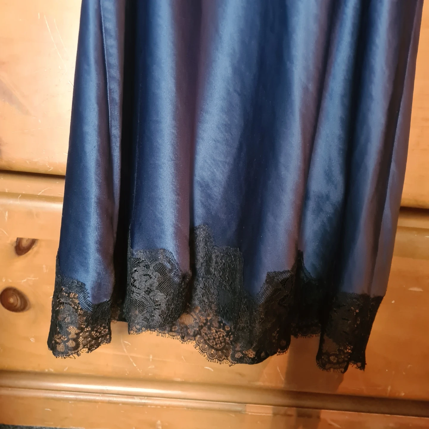 A lovely Darjeeling nightgown in a rich blue satin material. It features delicate black lace trim along the hem and neckline. Size 42 or L. This nightgown is perfect for comfortable evenings.