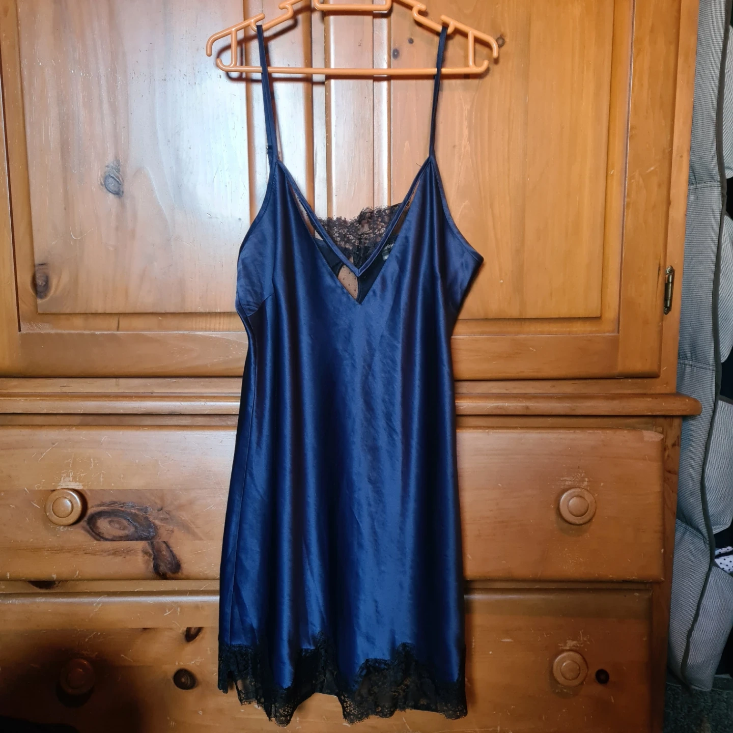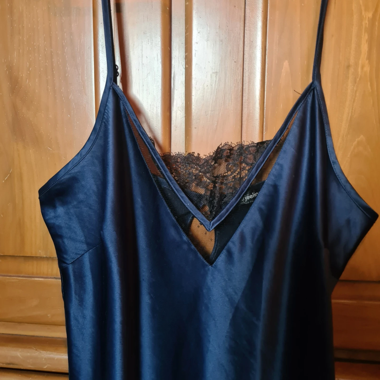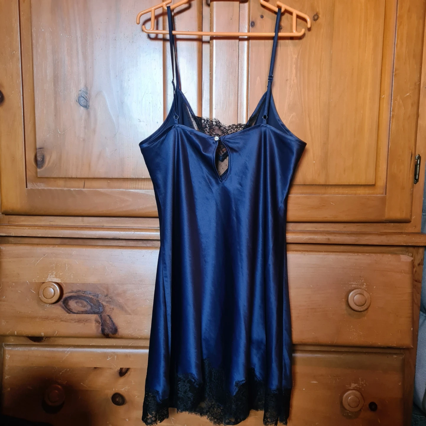 A lovely Darjeeling nightgown in a rich blue satin material. It features delicate black lace trim along the hem and neckline. Size 42 or L. This nightgown is perfect for comfortable evenings.