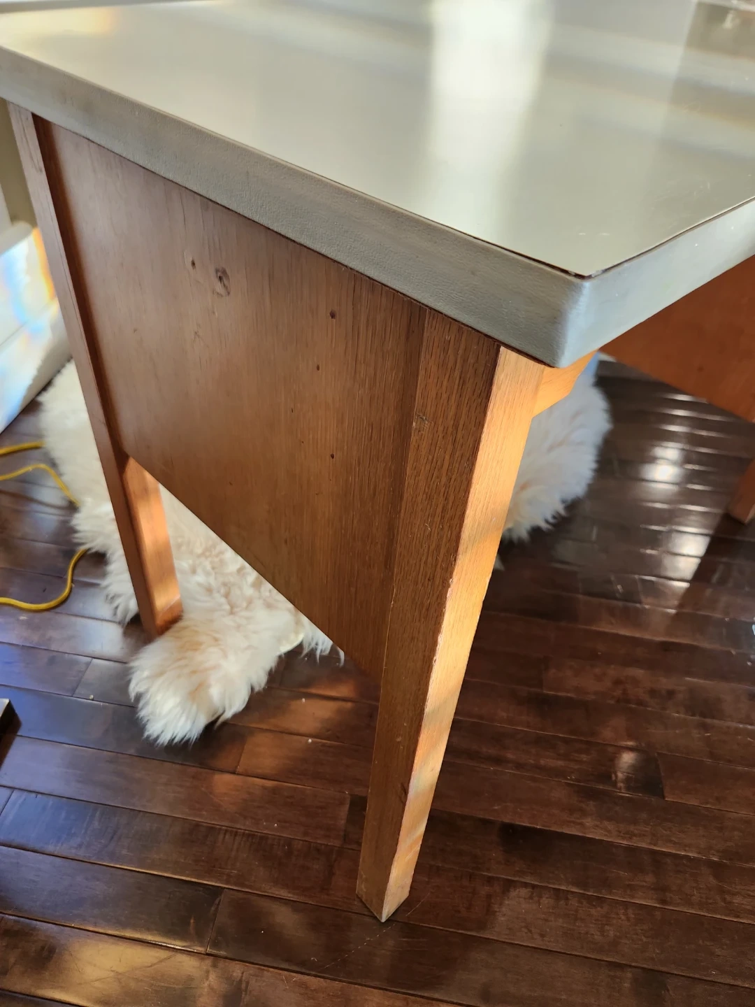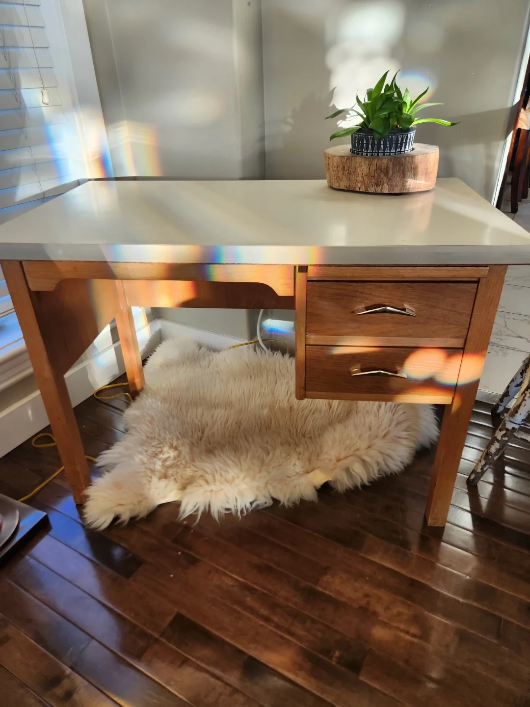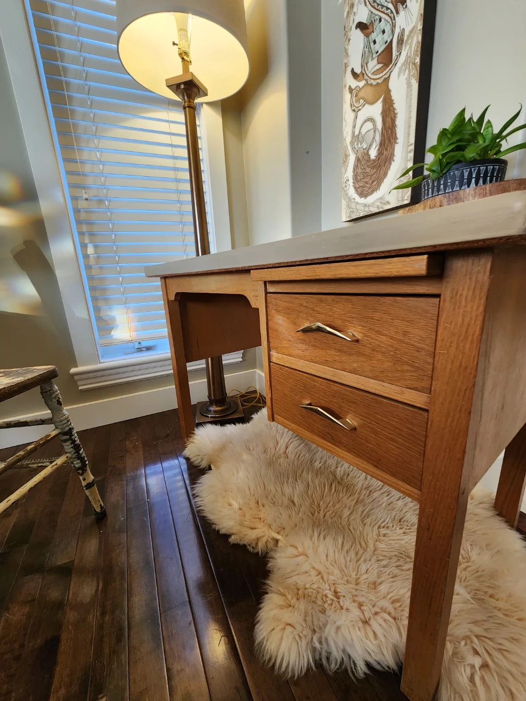 1950's MICRO desk features a light-coloured laminate top, it could use a bit of TLC, but the desk is super sturdy! Wooden base with two drawers are handy and handsome. The wood has a warm, natural finish. This 1950s piece is perfect for a tiny study nook. This small size friendly desk makes it perfect for closet office nooks. Surface is 36x 20 inches, and desk is 26 inches high....Adorable!