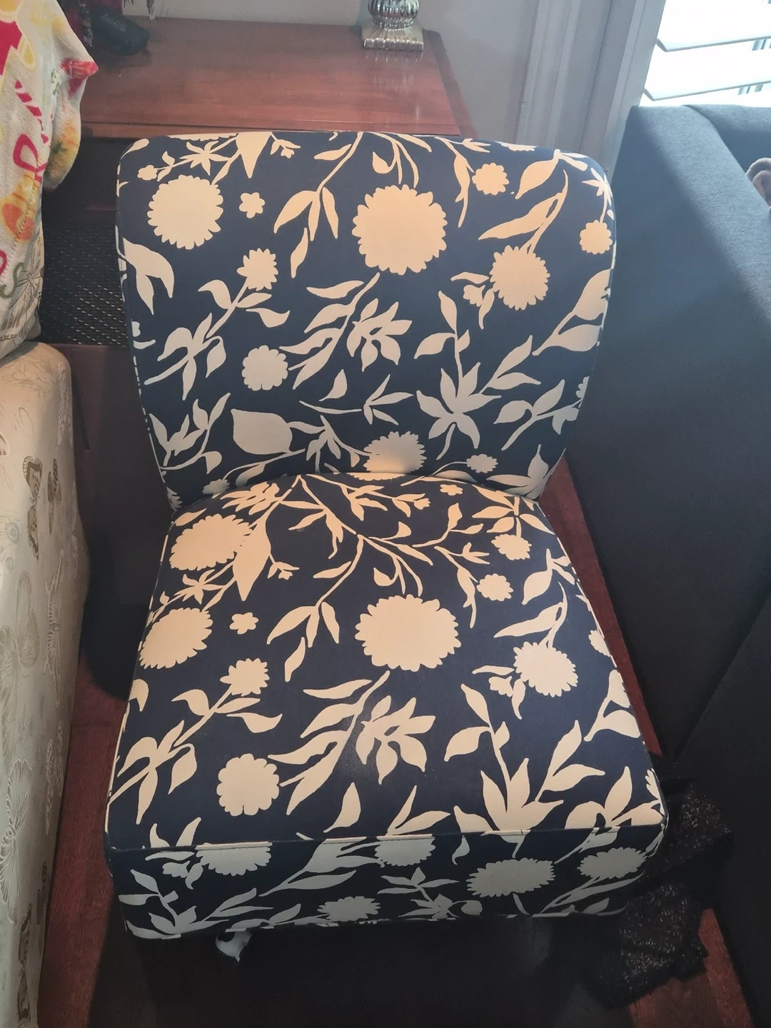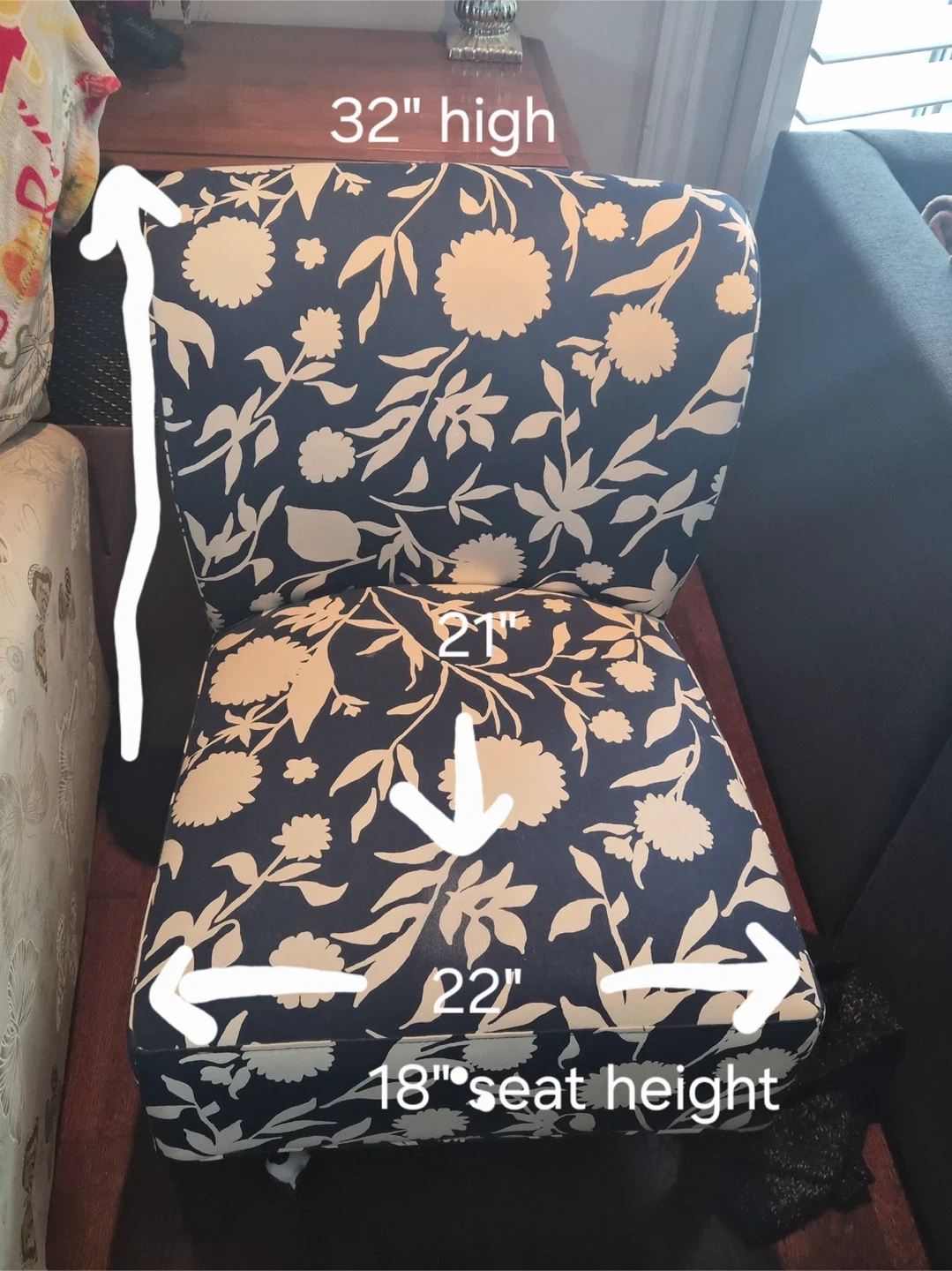Accent chair with a blue and white floral pattern. Overall height is 32 inches, seat width is 22 inches, and seat depth is 21 inches. Seat height is 18 inches. It's a comfortable chair for any room!