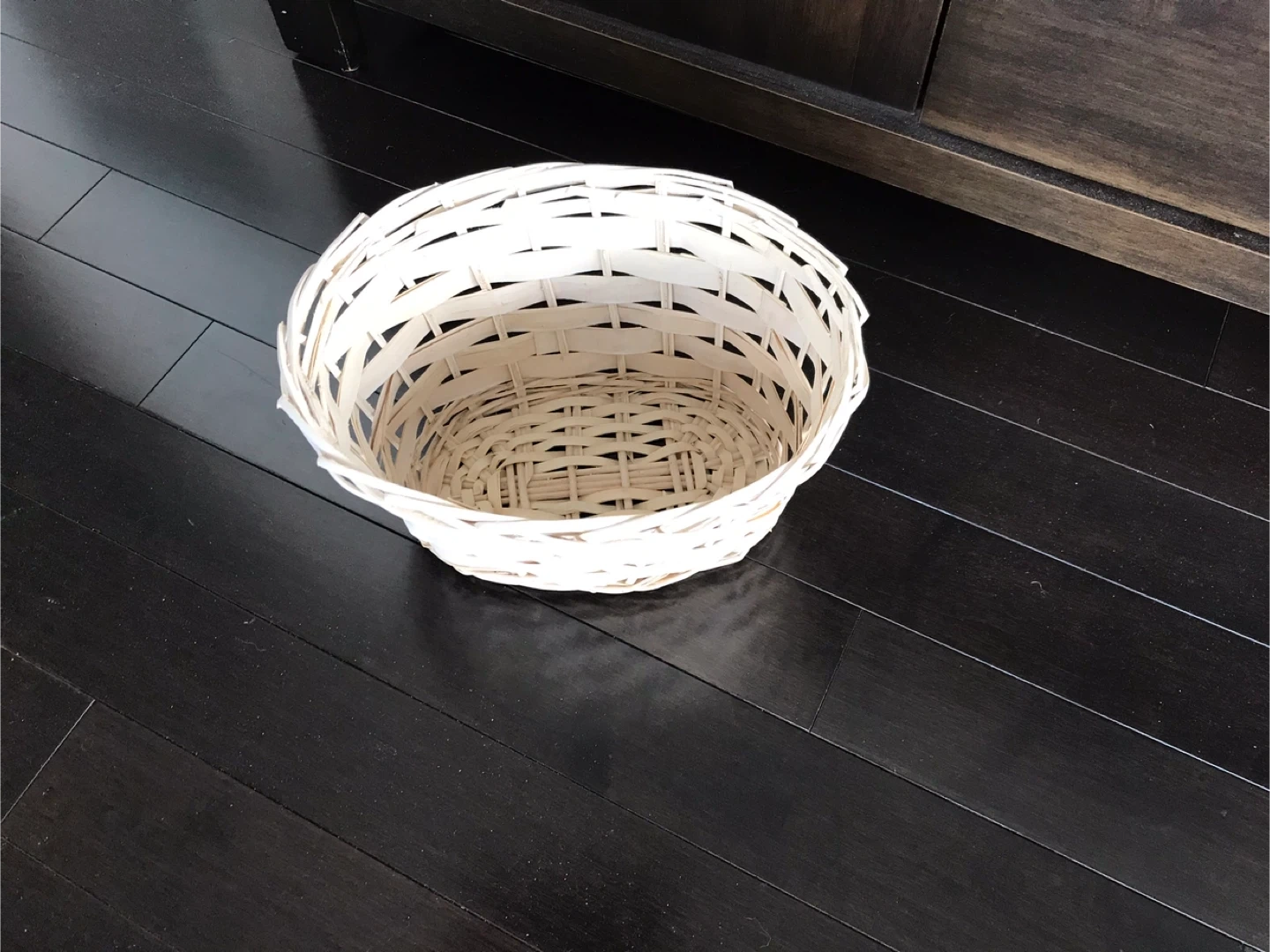 This is a round wicker basket. It's made of a light-coloured woven material. It's perfect for storage or decorative purposes.