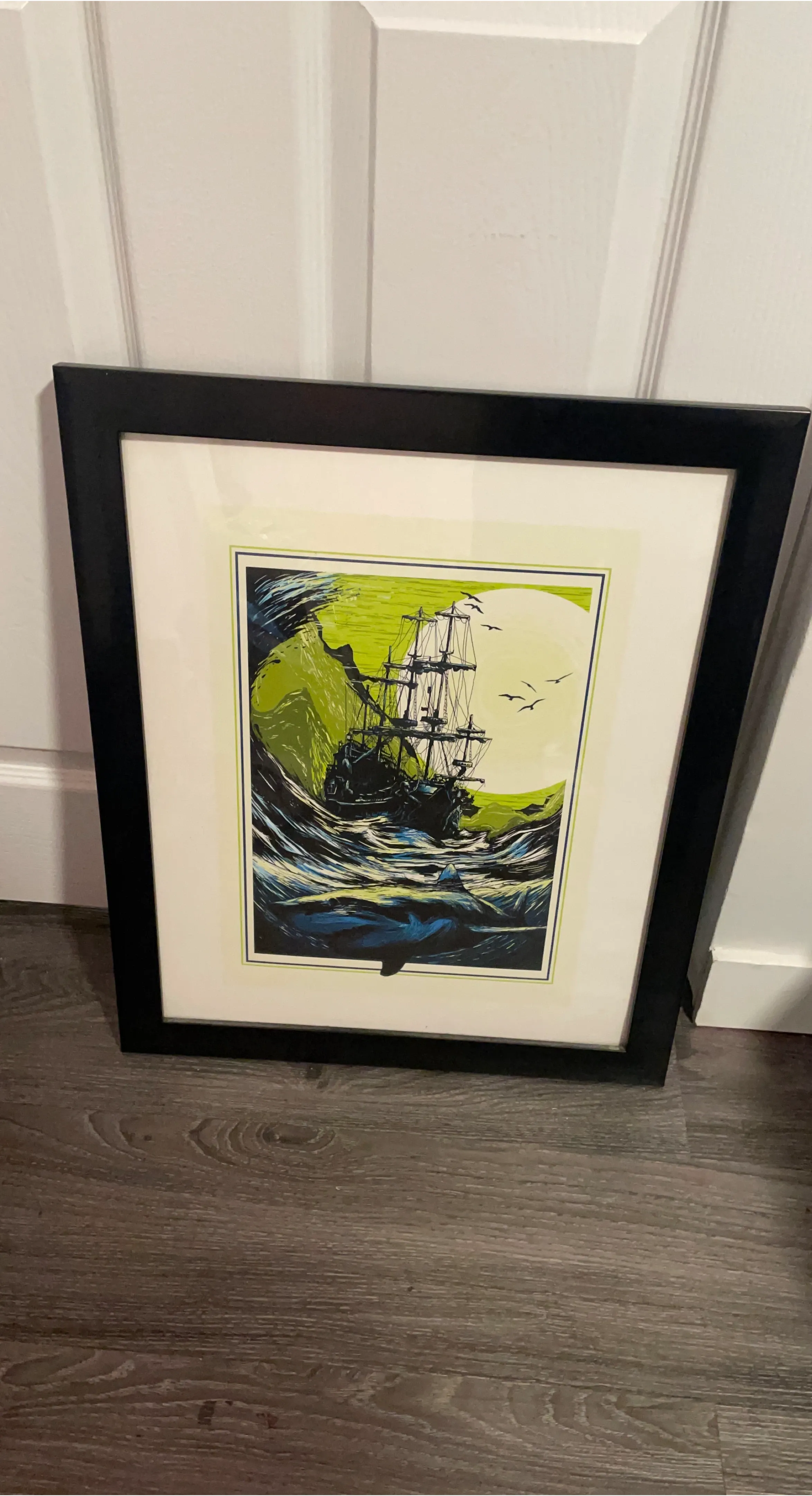 Framed artwork depicting a sailing ship navigating through a stormy sea with a whale nearby. It's framed in black. This piece would add a dramatic touch to any room.