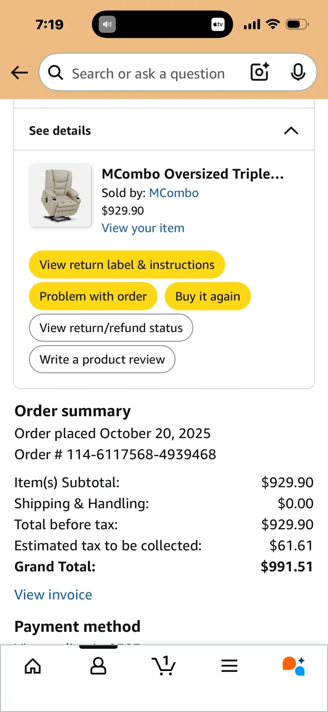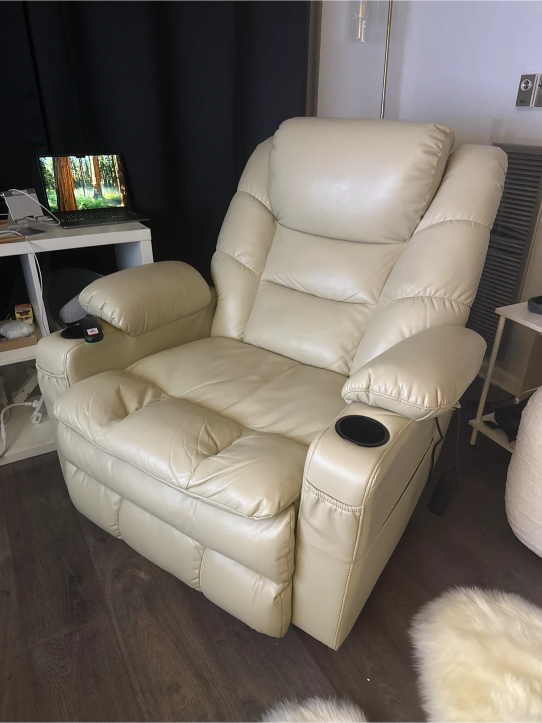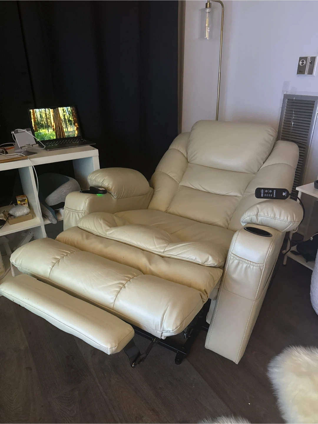 This MCombo recliner offers a comfortable seating experience. It's made of faux leather and features a cup holder. The chair reclines with a power lift function. It includes a remote for operations.