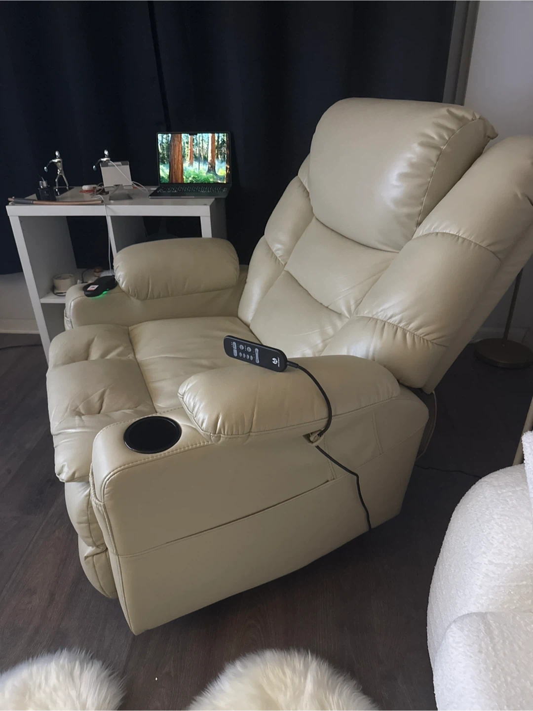 This MCombo recliner offers a comfortable seating experience. It's made of faux leather and features a cup holder. The chair reclines with a power lift function. It includes a remote for operations.