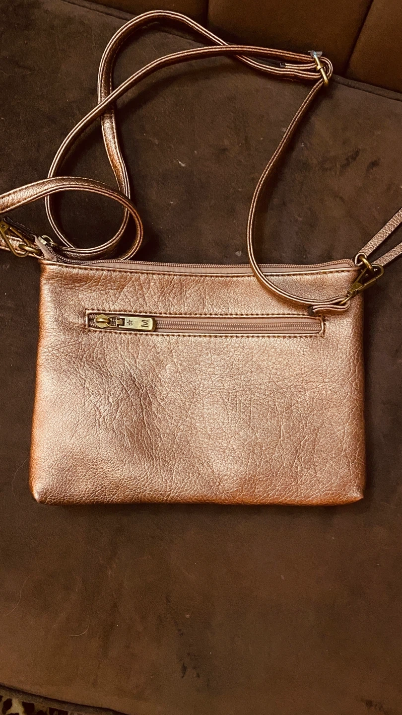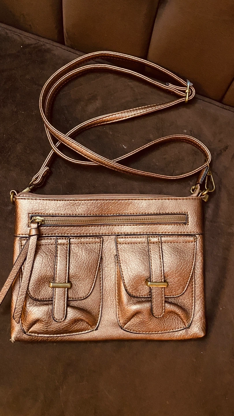 This stylish crossbody purse comes in a lovely rose gold metallic finish. It features two front pockets with buckle closures and a zippered main compartment. The adjustable strap makes it comfortable to wear.