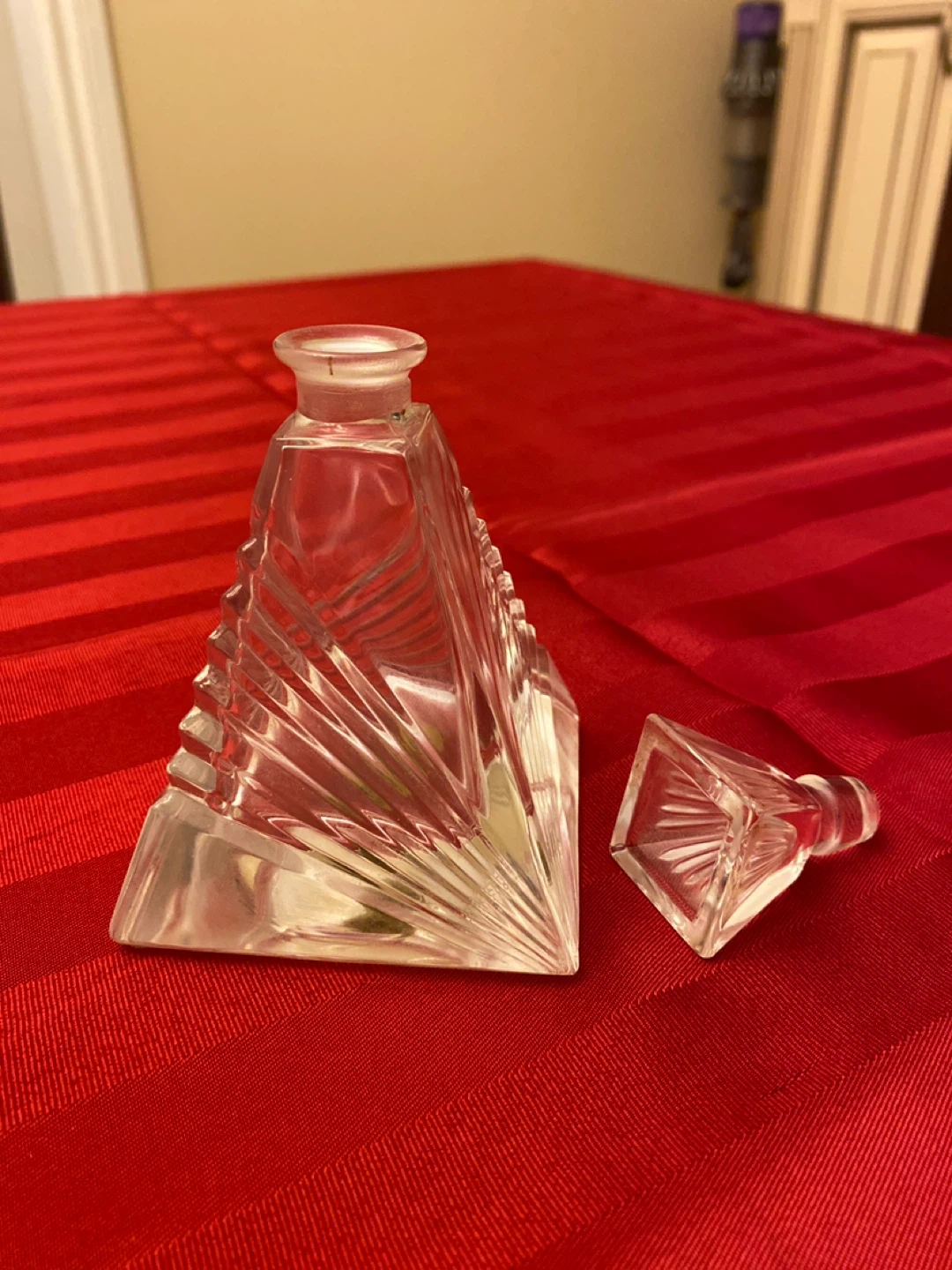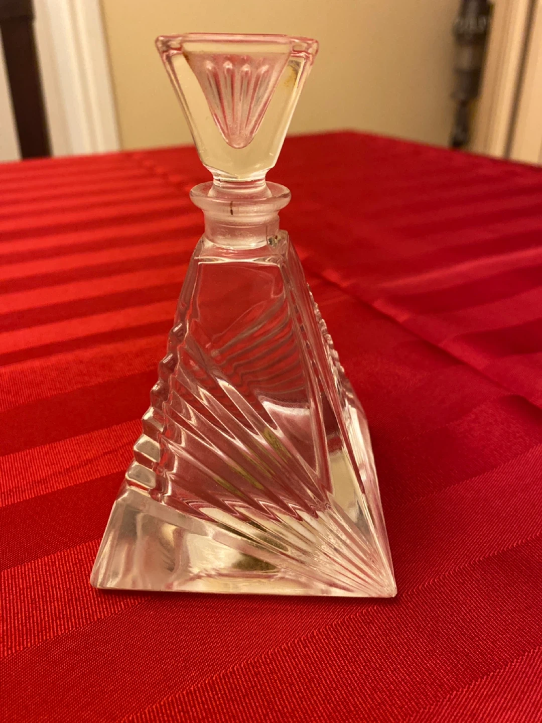 A beautiful crystal glass perfume bottle with an ornate stopper. This elegant decanter has a unique faceted design. It's perfect for displaying your favourite fragrance.
