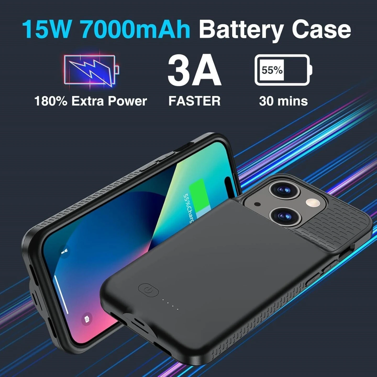 This is a 7000mAh battery case for the 6.1-inch iPhone 15 and iPhone 15 Pro. It offers all-around protection and provides 180% extra power. It also includes a 3A charging port and a power indicator.