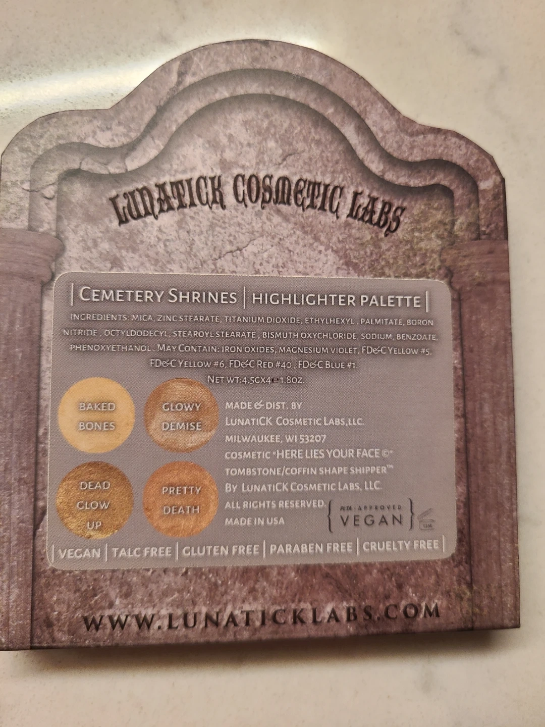 Four shades of highlighter in a tombstone-shaped palette. Includes 'Baked Bones', 'Glowy Demise', 'Dead Glow', and 'Pretty Death'. This palette is vegan, talc-free, gluten-free, paraben-free, and cruelty-free.