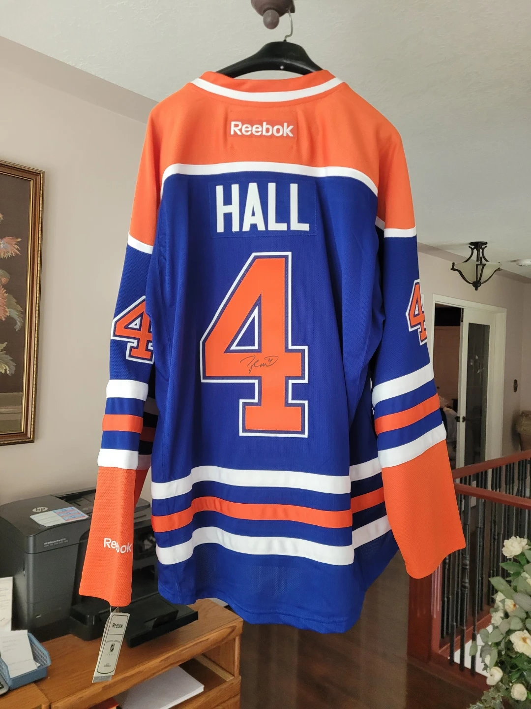 Official Reebok Edmonton Oilers jersey featuring player Taylor Hall's name and number. It's a replica style with official team colours and logos. Great for any Oilers fan! This jersey has never been worn.