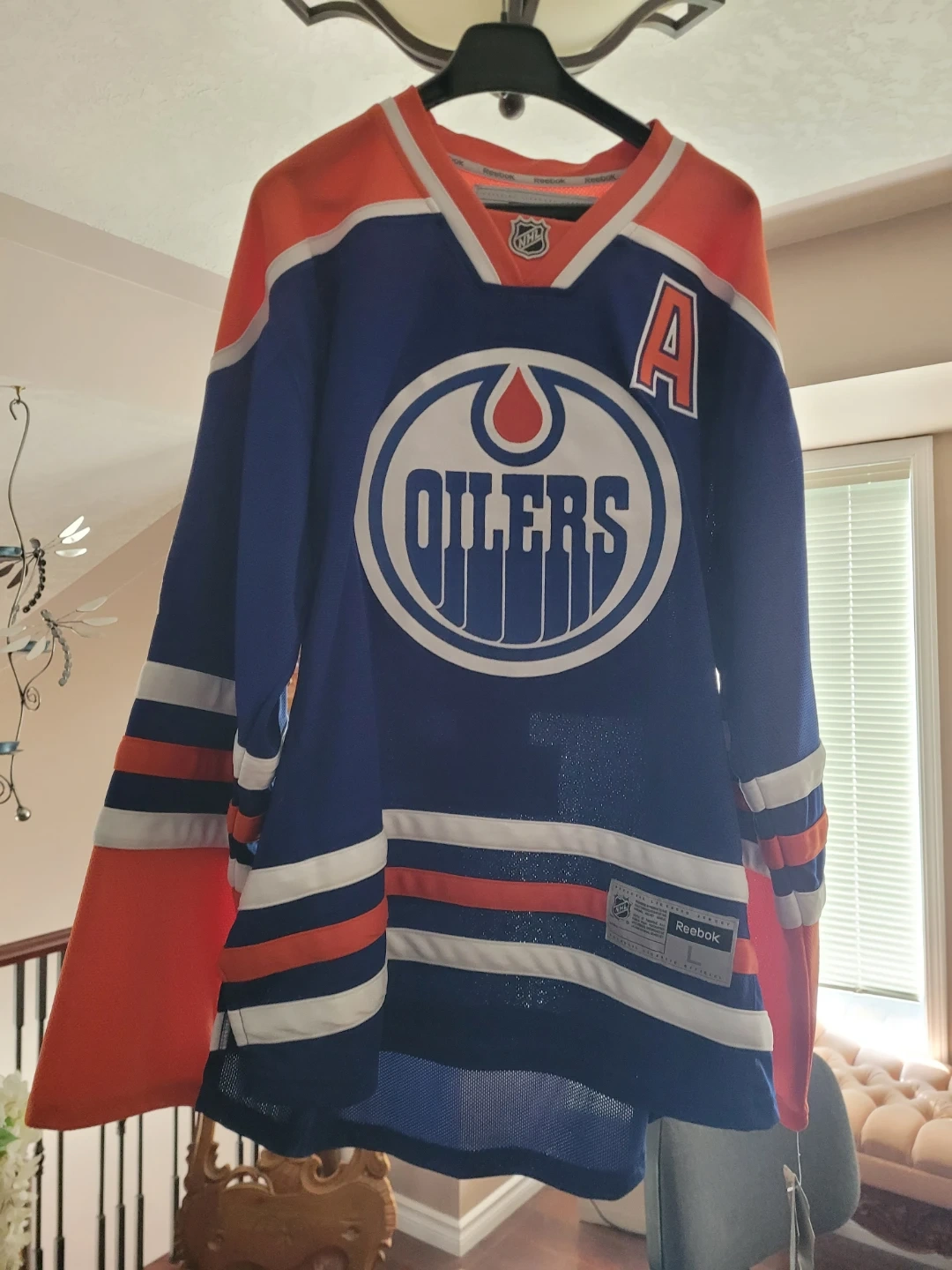 Official Reebok Edmonton Oilers jersey featuring player Taylor Hall's name and number. It's a replica style with official team colours and logos. Great for any Oilers fan! This jersey has never been worn.