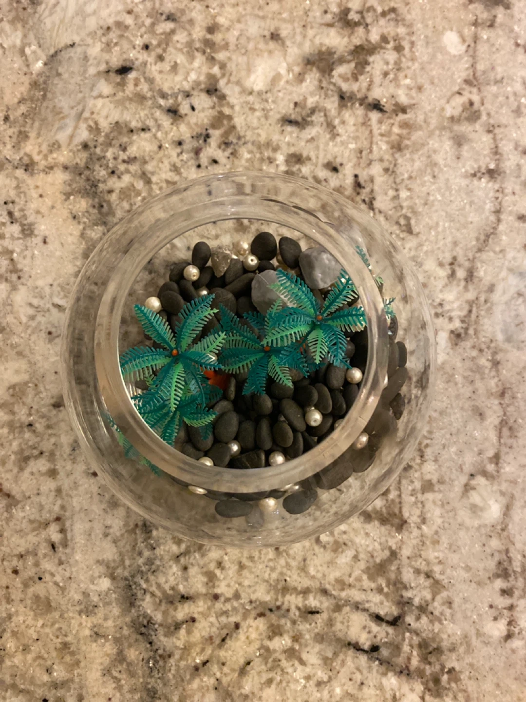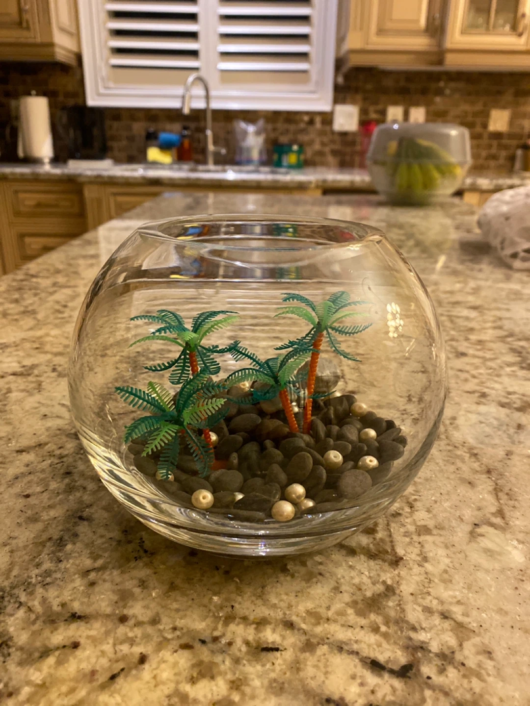 A decorative glass fish bowl featuring a miniature tropical scene with palm trees and decorative stones. It's suitable for small aquatic pets or as a standalone decorative piece. The glass bowl offers a clear view of the enclosed environment.