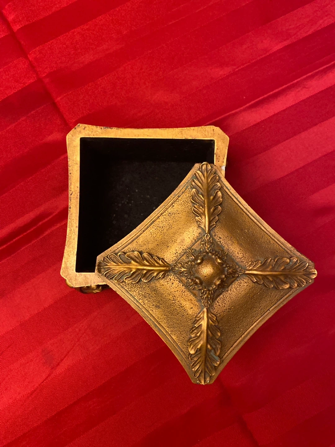 This is a decorative trinket box with an ornate gold-tone finish. It features intricate embossed detailing on the lid and sides. The interior is lined with black material. It's perfect for storing small jewellery or keepsakes!