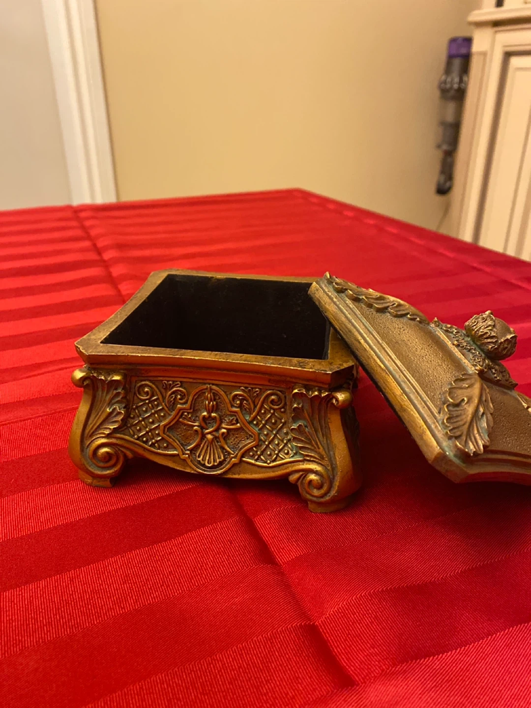 This is a decorative trinket box with an ornate gold-tone finish. It features intricate embossed detailing on the lid and sides. The interior is lined with black material. It's perfect for storing small jewellery or keepsakes!