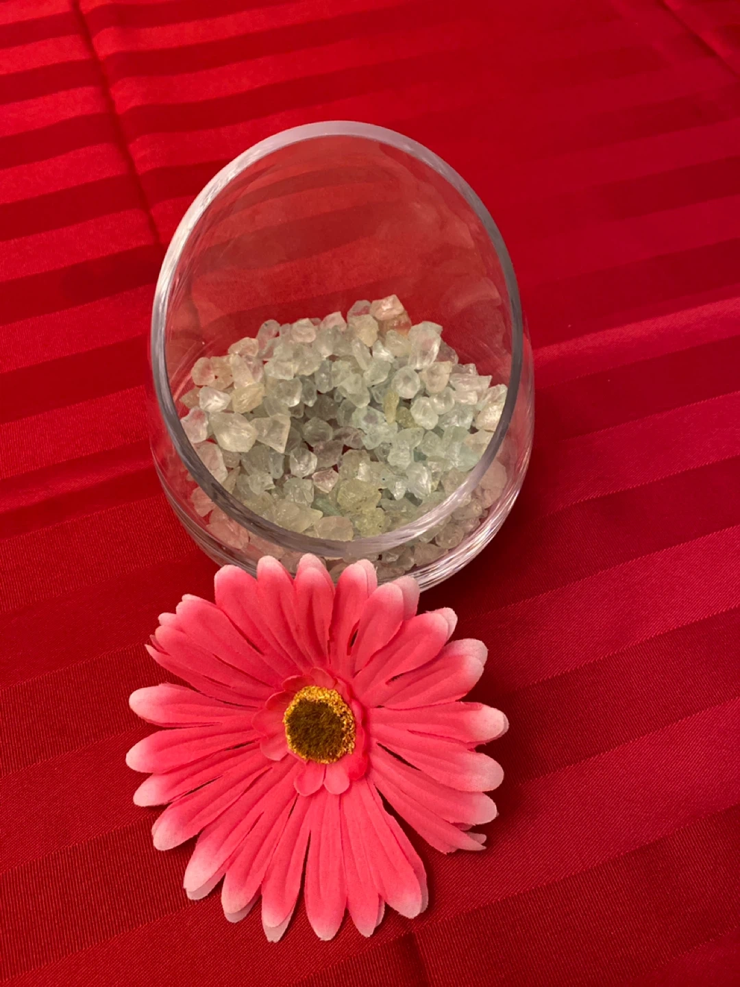 Pink artificial daisy in glass/ stones