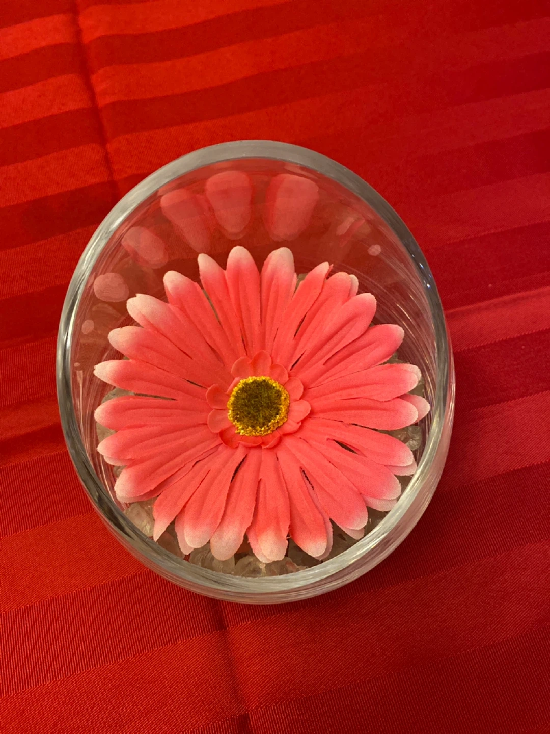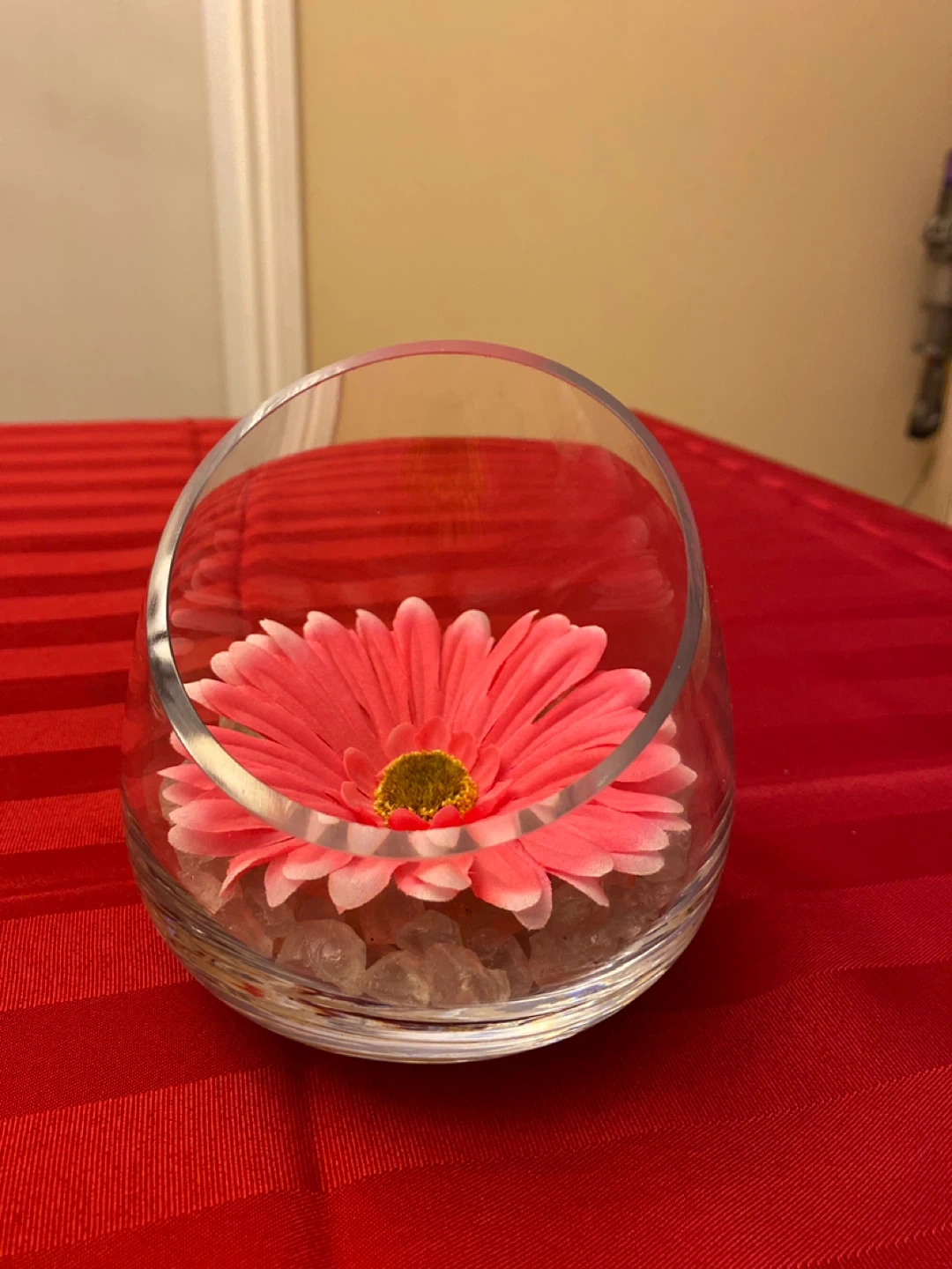 Pink artificial daisy in glass/ stones