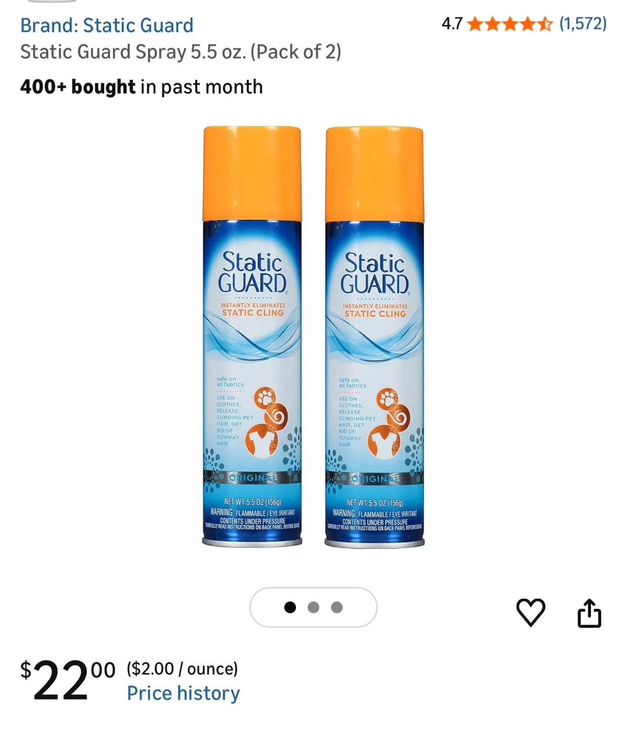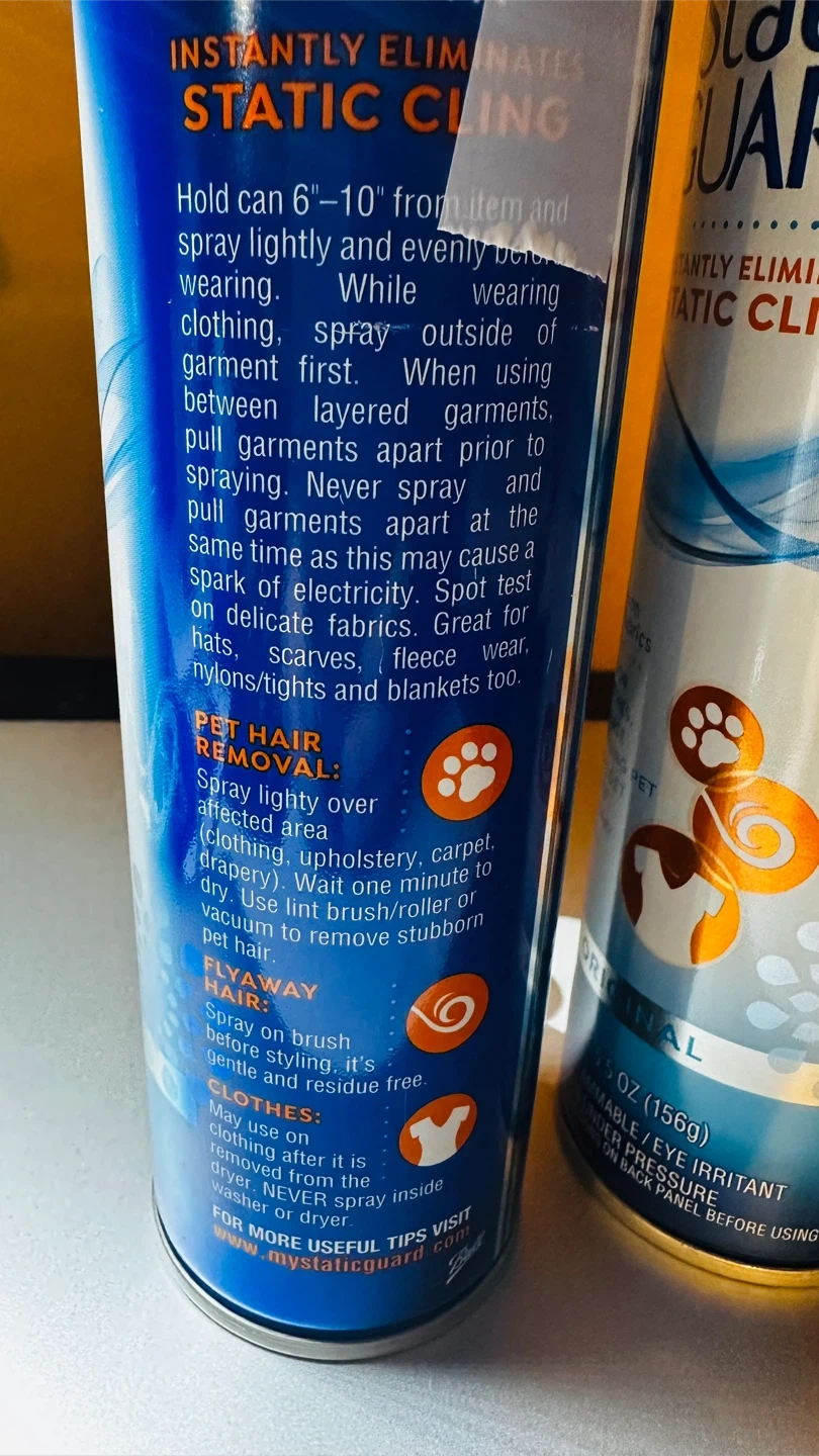 This is a 2-pack of Static Guard spray that instantly eliminates static cling. It's safe on all fabrics and can be used on clothes, releasing clinging pet hair, and flyaway hair. Each can contains 5.5 oz (156g) of product.