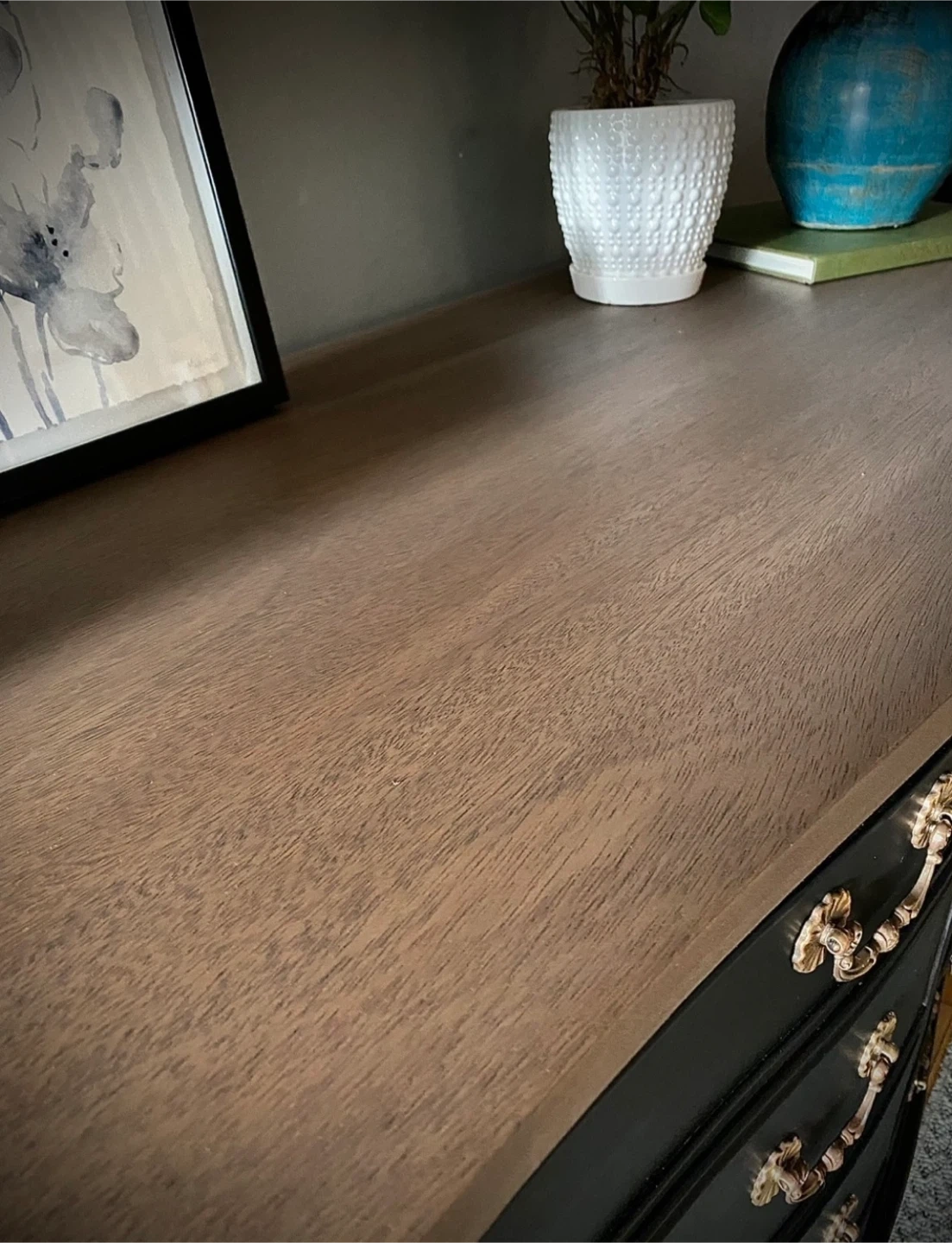 • Top & Base: Fully sanded, paint-washed to neutralize the red mahogany tones, then stained in Cappuccino SFO