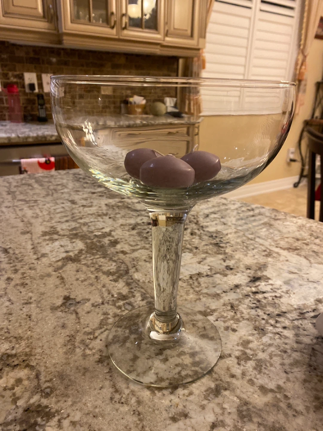 This is a large, clear glass trumpet-style vase. It comes with three mauve, spherical candles. Its stem has a decorative marbled finish. It's perfect for displaying flowers or as a centrepiece!