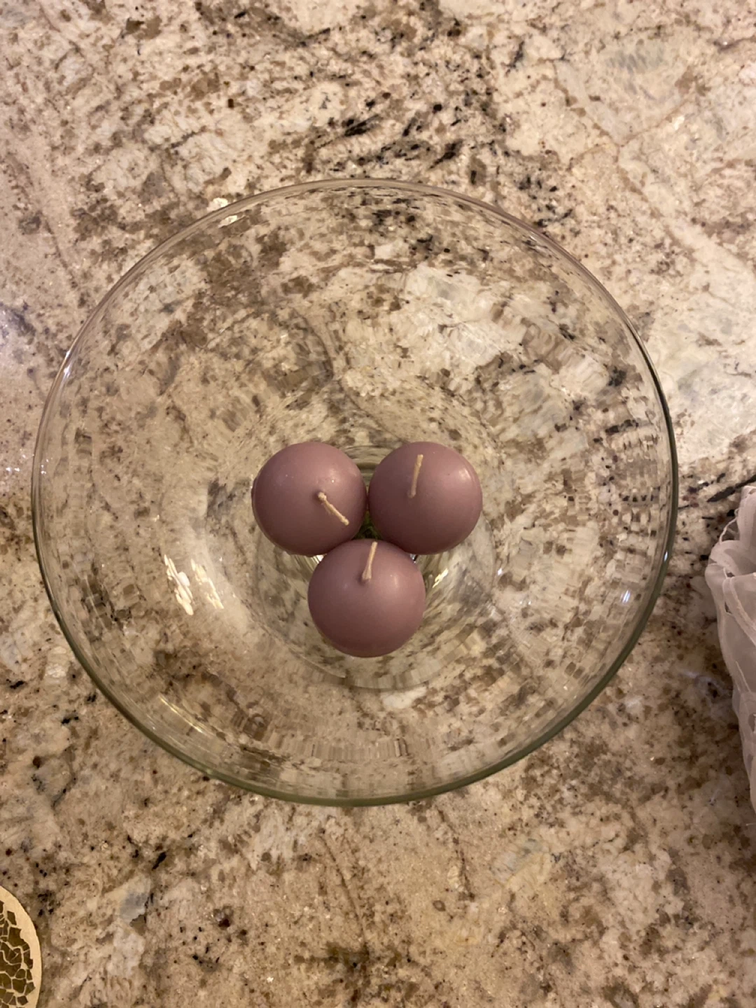 This is a large, clear glass trumpet-style vase. It comes with three mauve, spherical candles. Its stem has a decorative marbled finish. It's perfect for displaying flowers or as a centrepiece!