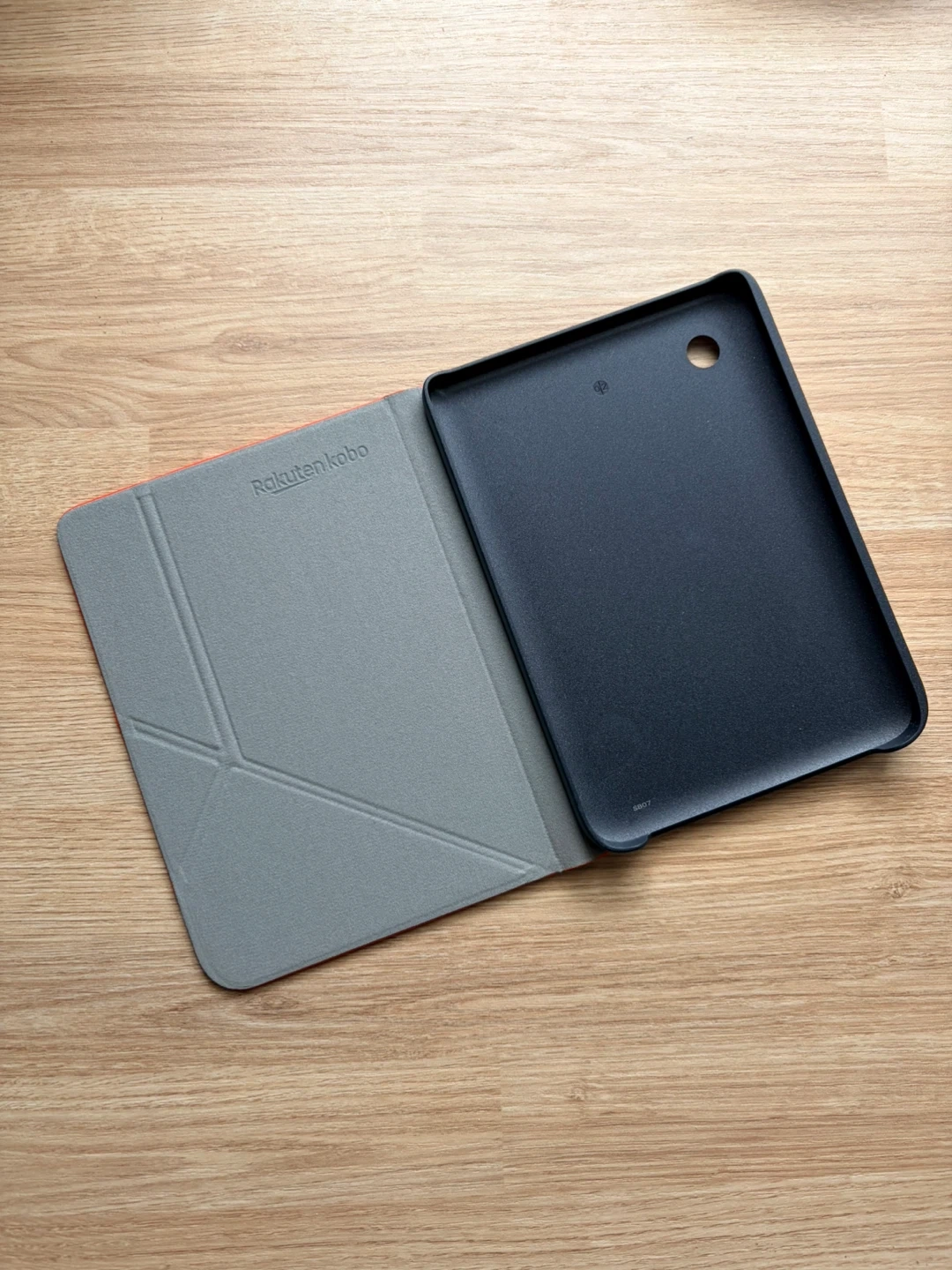 This is a red folio case for your Rakuten Kobo e-reader. It has a soft grey interior lining and a secure black holder. It offers protection for your device.