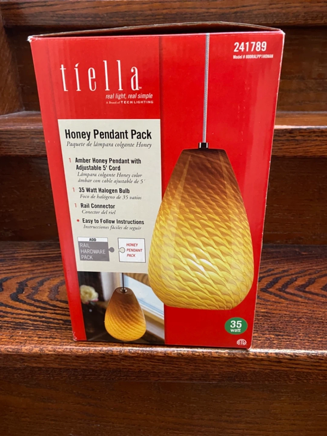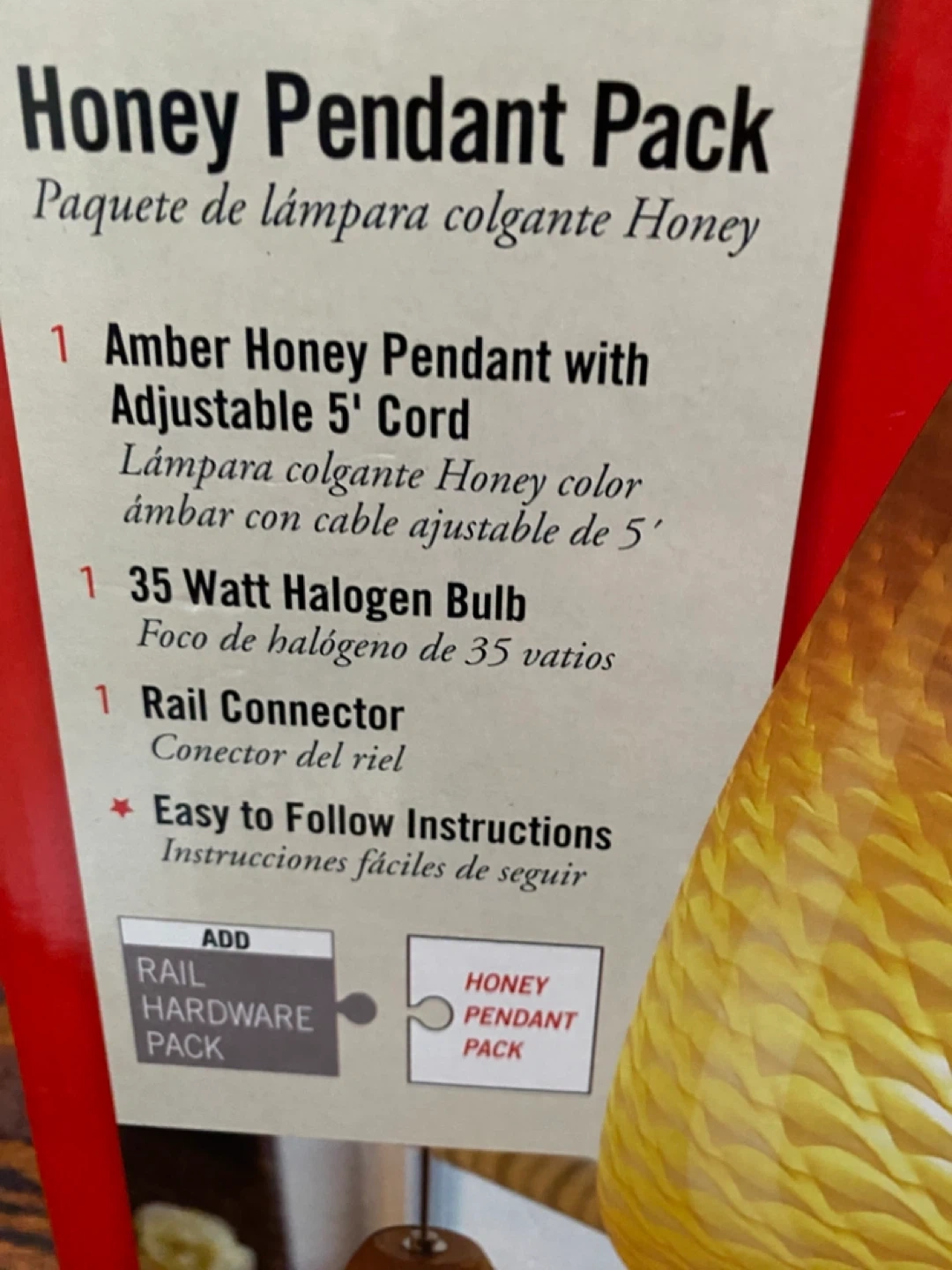 This Tiella Honey Pendant Pack includes one amber honey pendant with an adjustable 5' cord. It also comes with a 35 Watt halogen bulb. Easy to follow instructions are included.