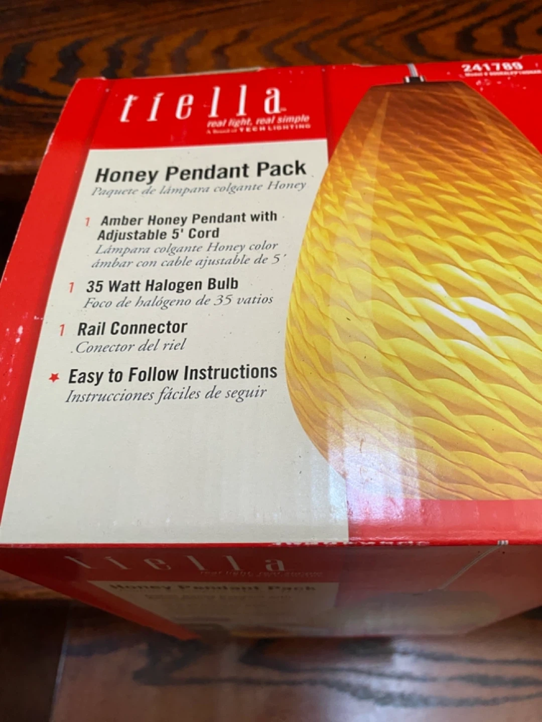 This Tiella Honey Pendant Pack includes one amber honey pendant with an adjustable 5' cord. It also comes with a 35 Watt halogen bulb. Easy to follow instructions are included.