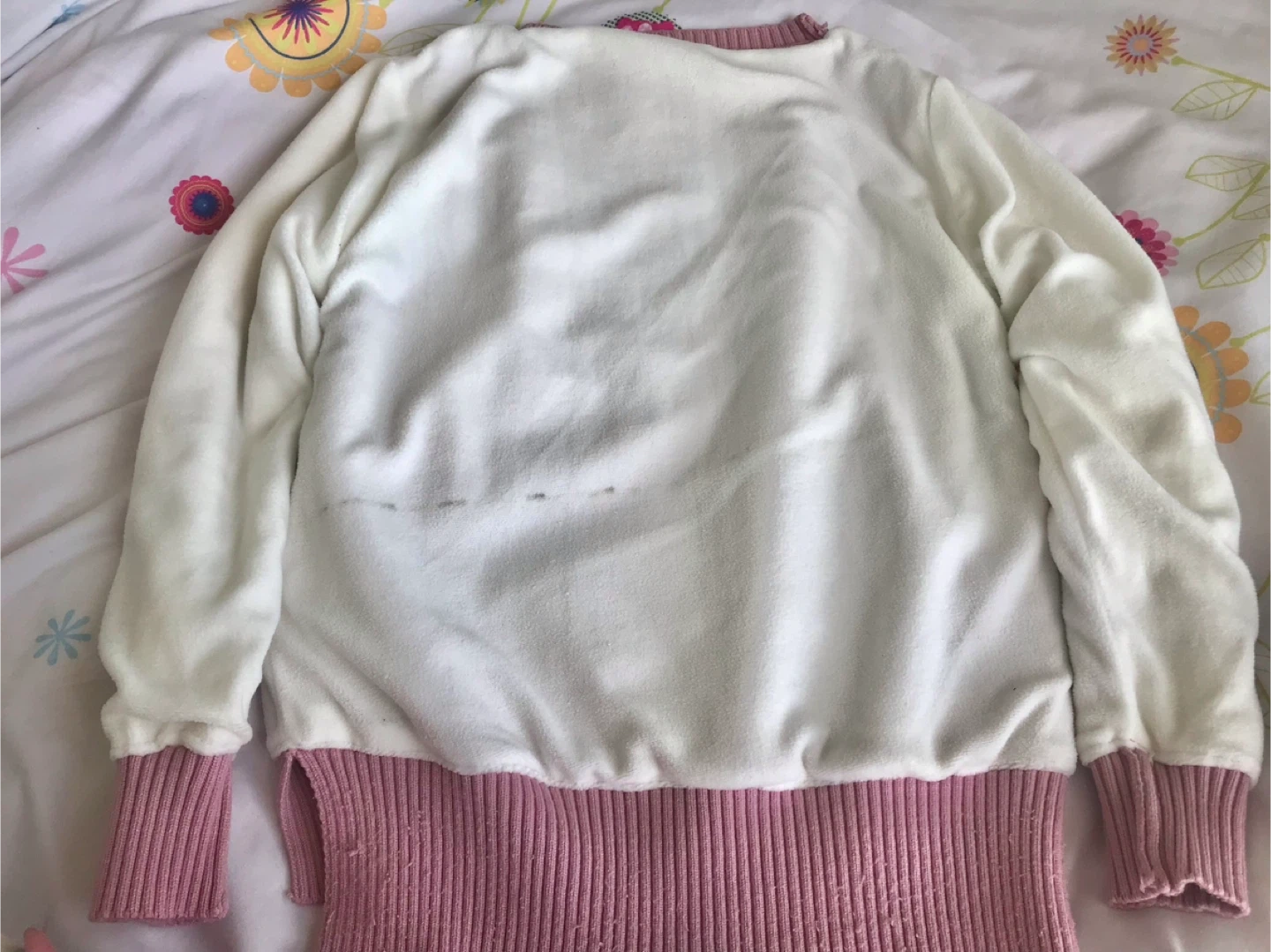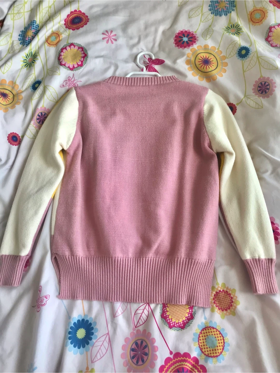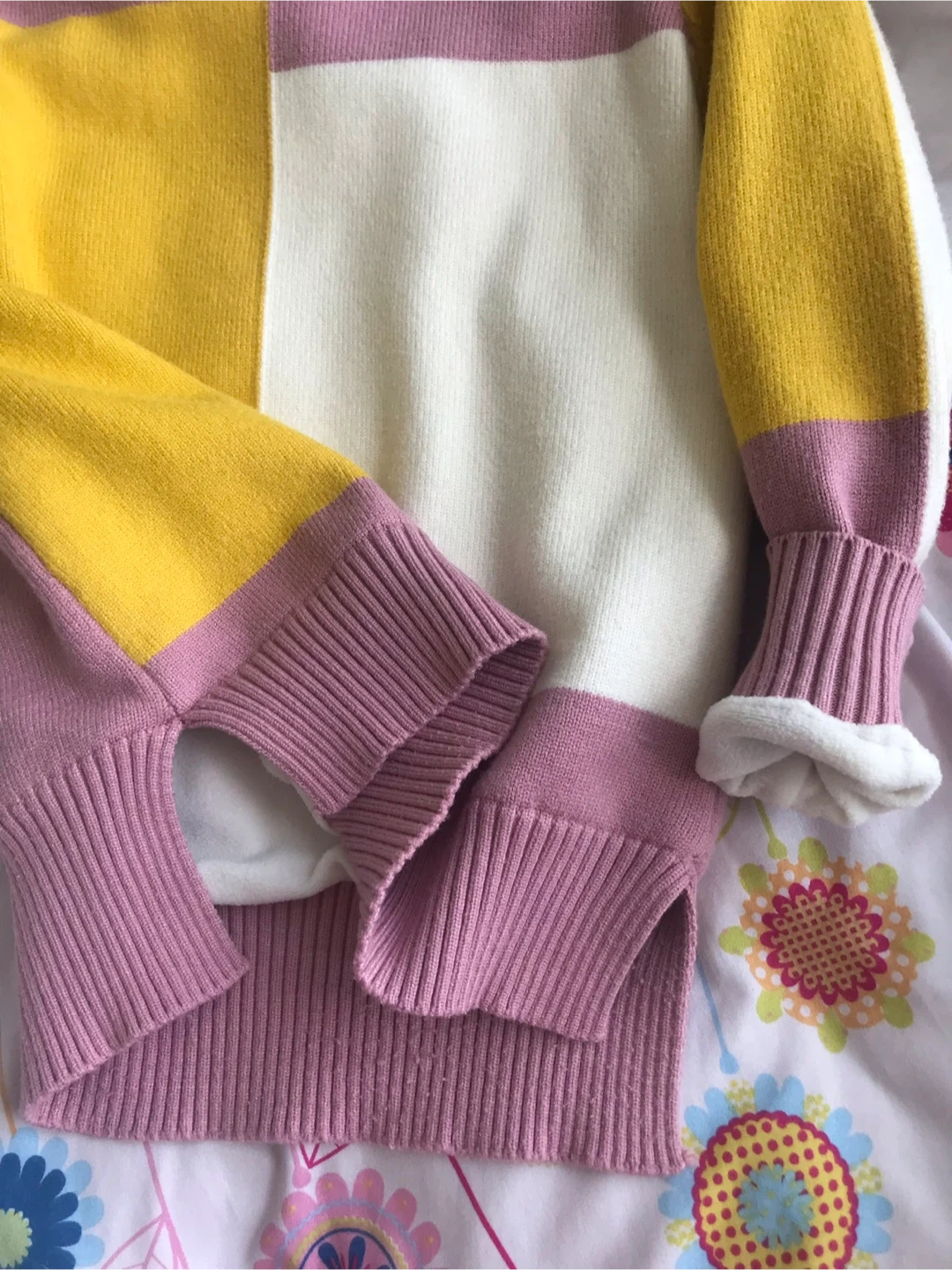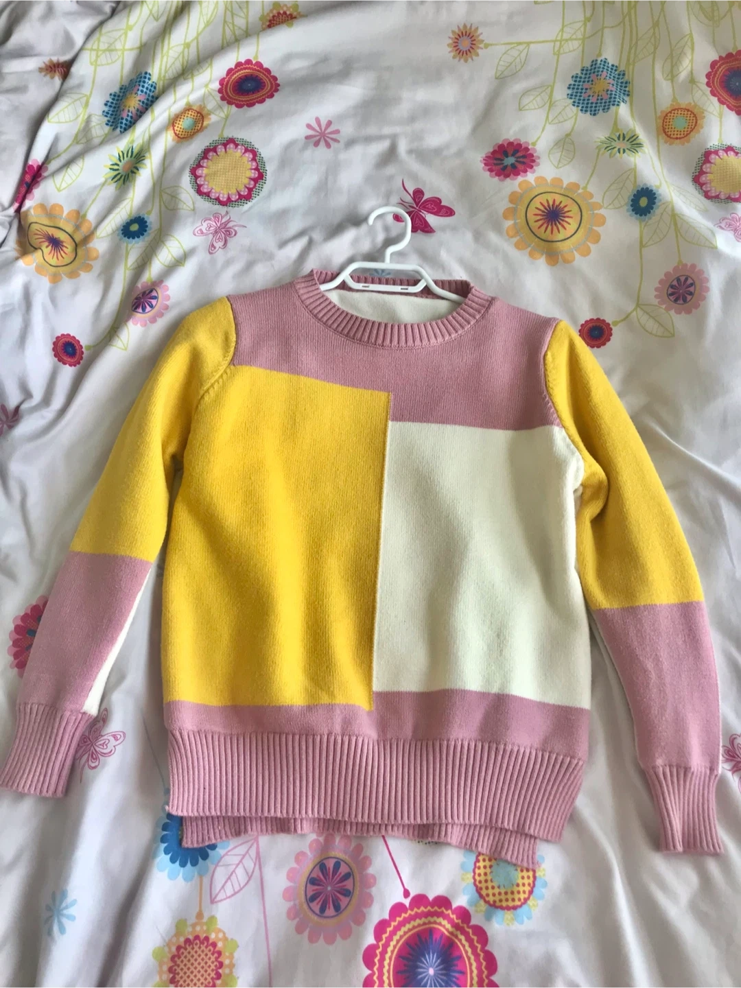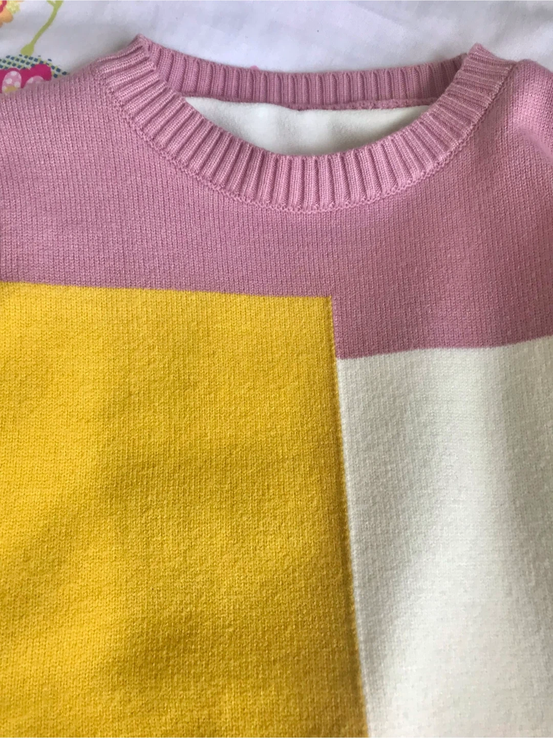 This is a fun crewneck sweater with a colour-blocked design. It features panels of yellow, white, and pink. The ribbed cuffs and hem add a classic touch. It’s thick and warm for the cold days.