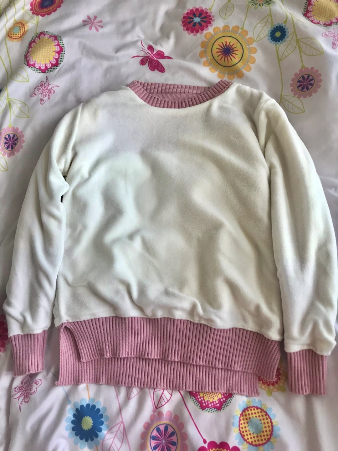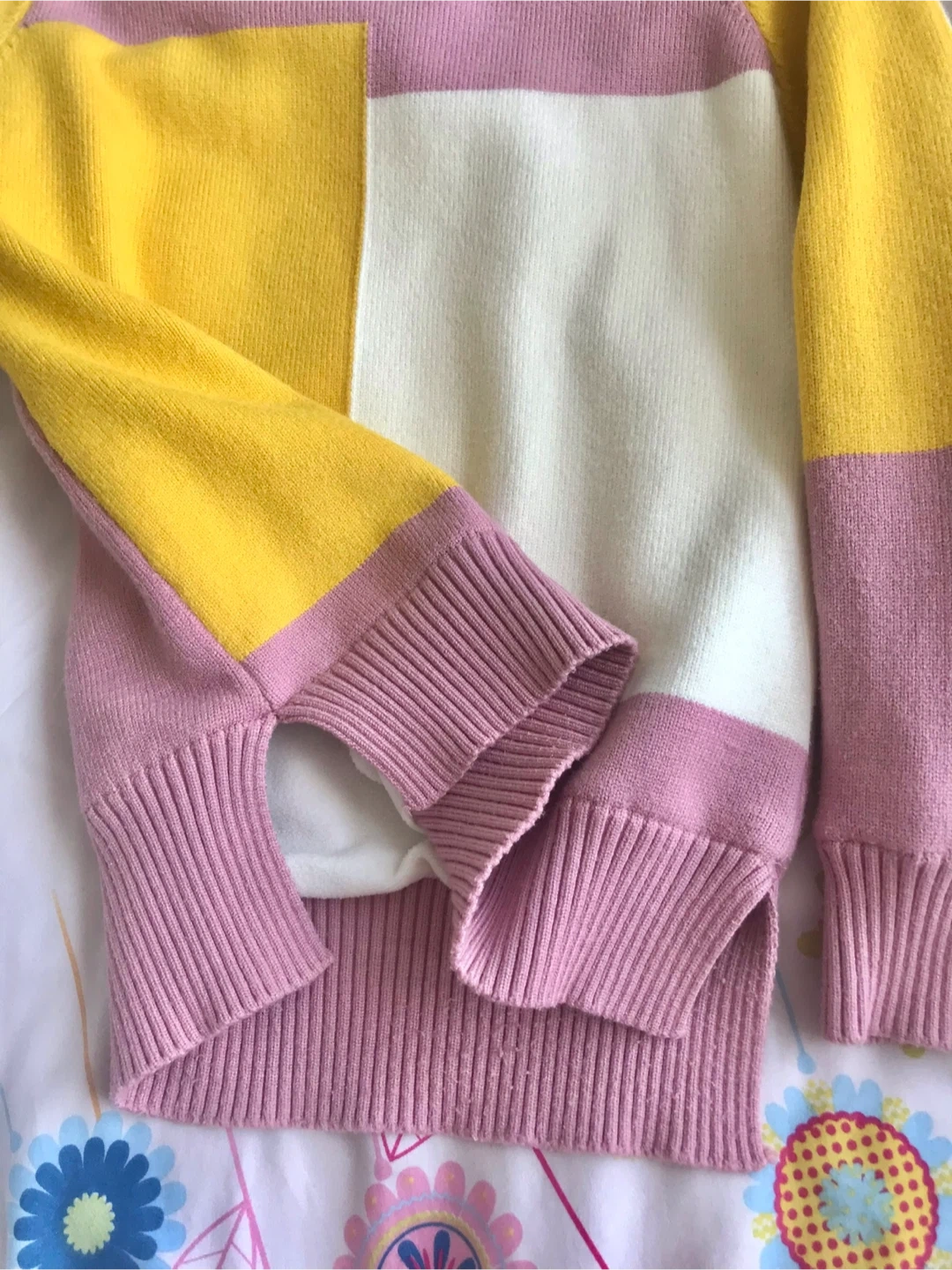This is a fun crewneck sweater with a colour-blocked design. It features panels of yellow, white, and pink. The ribbed cuffs and hem add a classic touch. It’s thick and warm for the cold days.