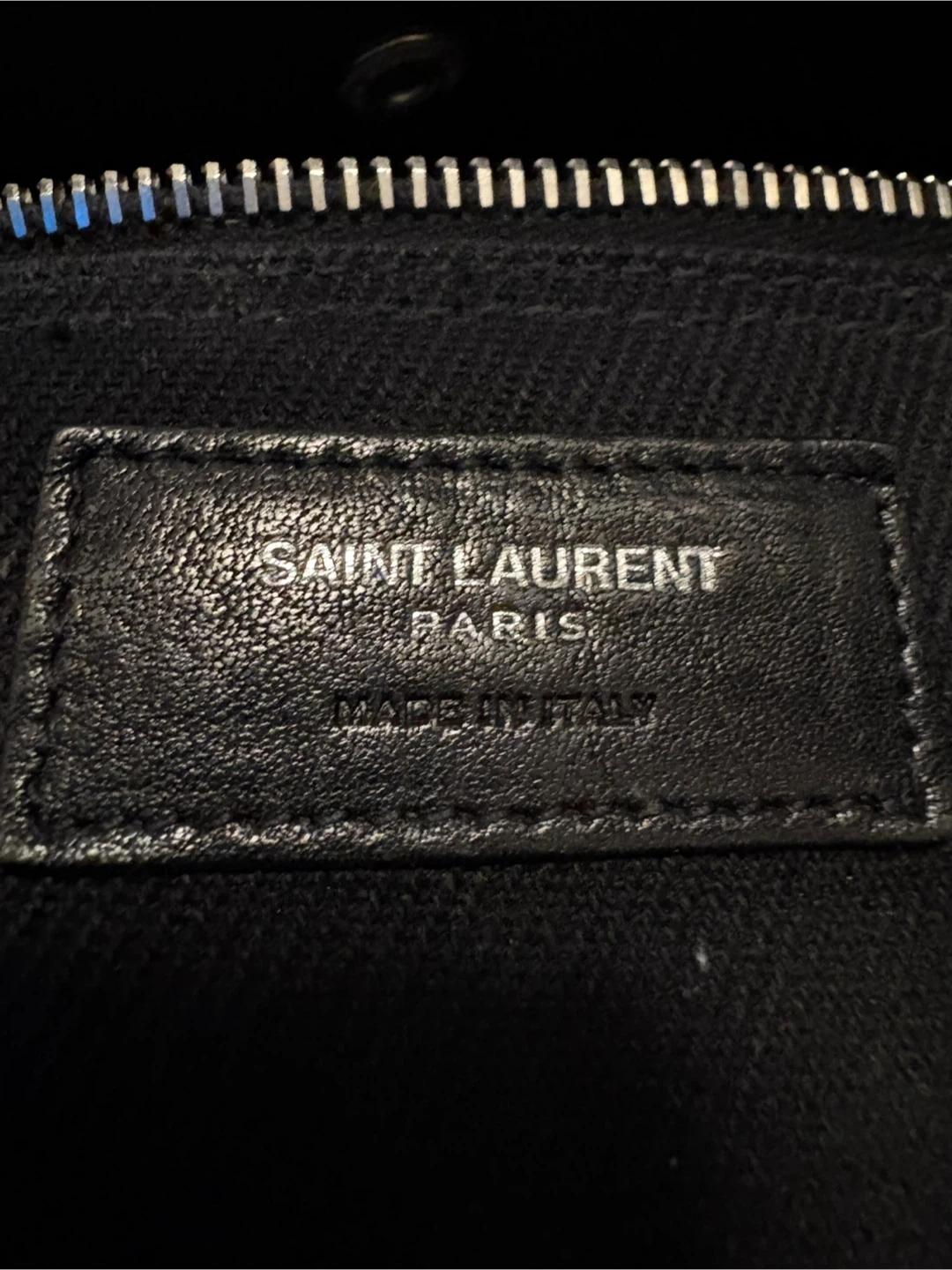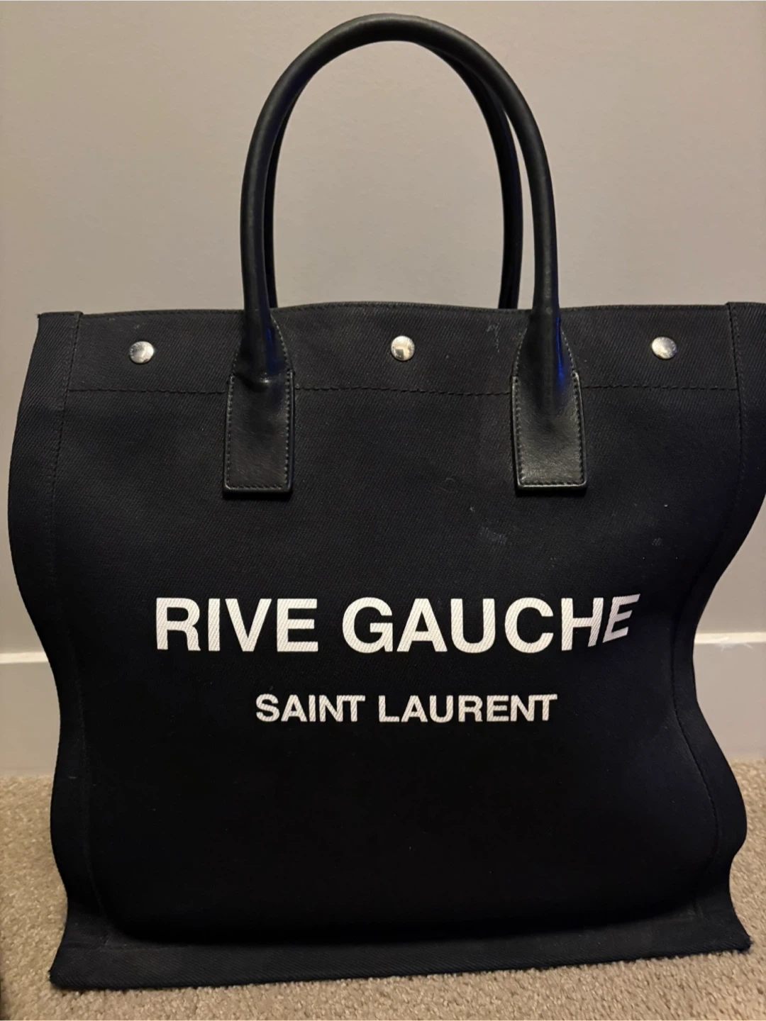 This is a Saint Laurent Rive Gauche tote bag. It's made in Italy from canvas and leather. This bag is perfect for everyday use or travel.