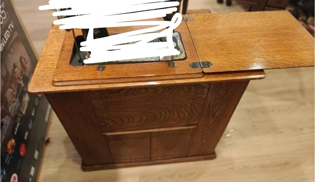 This is a beautiful antique sewing machine cabinet made of solid wood. It features a pull-out table and storage drawers. It's a lovely piece for any home! Only table. . Machine not included