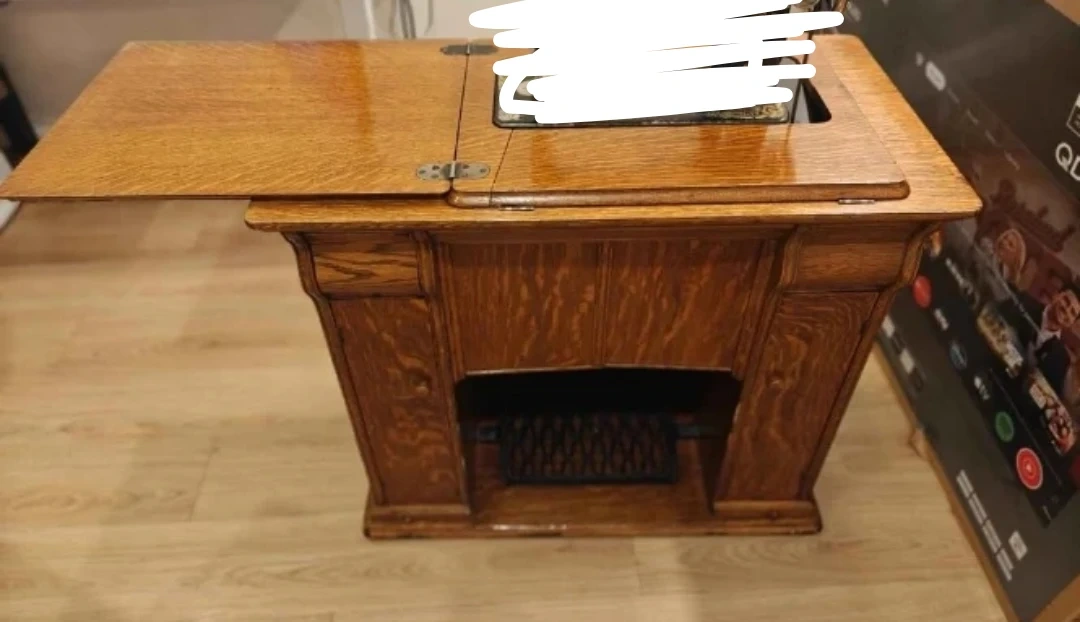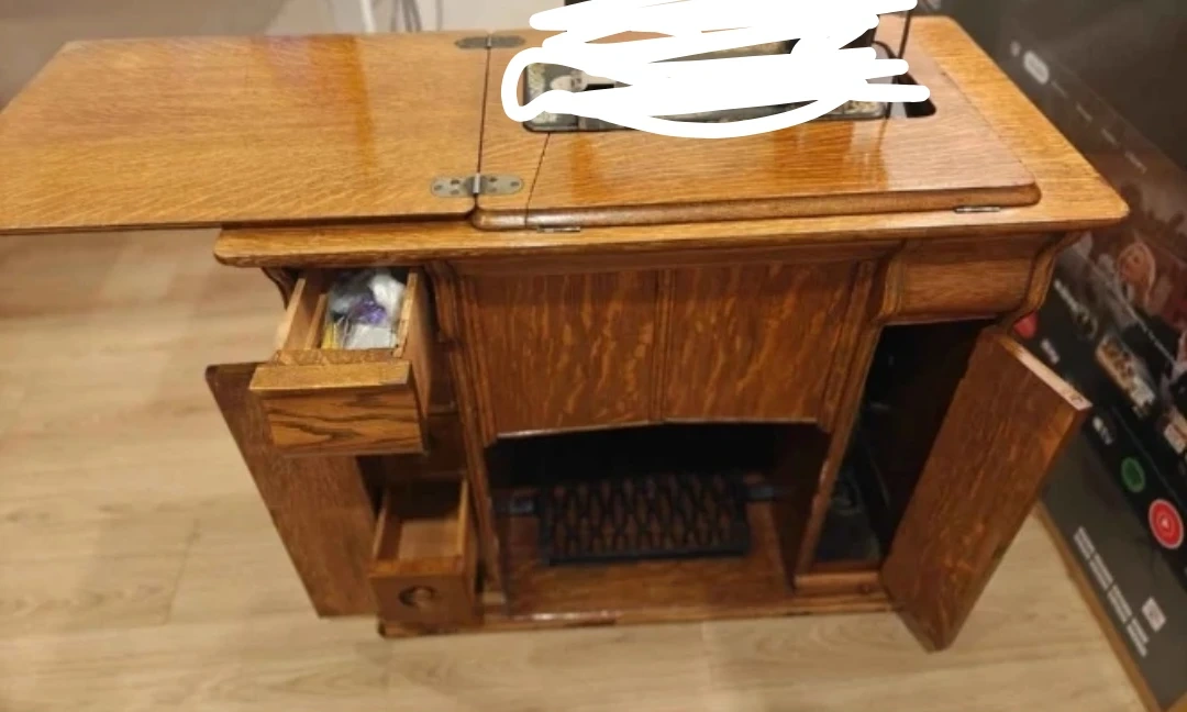 This is a beautiful antique sewing machine cabinet made of solid wood. It features a pull-out table and storage drawers. It's a lovely piece for any home! Only table. . Machine not included