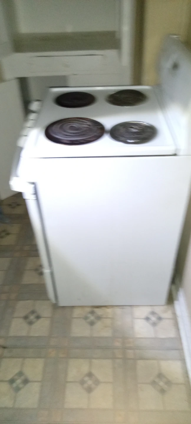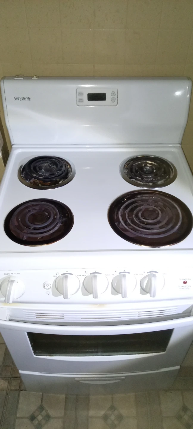 White electric stove with four coil burners and an oven. It has a digital display on the control panel. This appliance is great for everyday cooking needs.