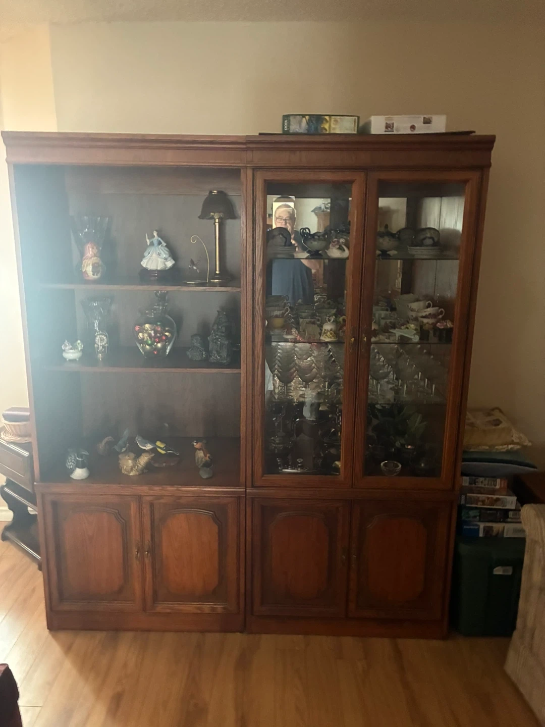 A beautiful wooden hutch with glass display cabinets. It features adjustable shelves for showcasing your collectibles and storage cabinets at the base. Great for displaying dinnerware or decorative items!
