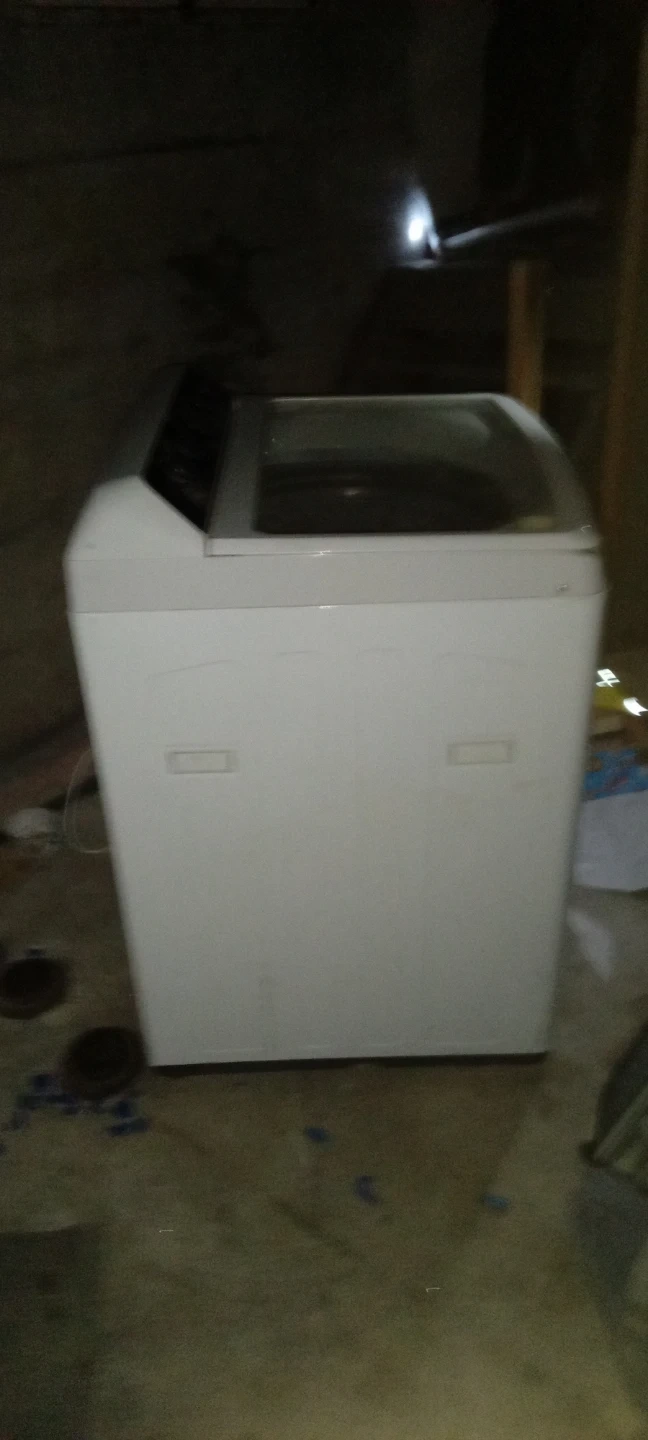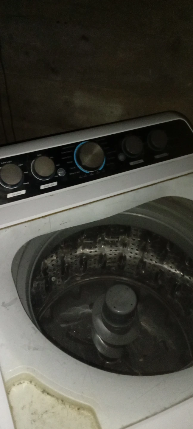This is a white top-load washing machine. It has a clear lid so you can see inside during operation. The control panel offers multiple settings for your laundry needs.