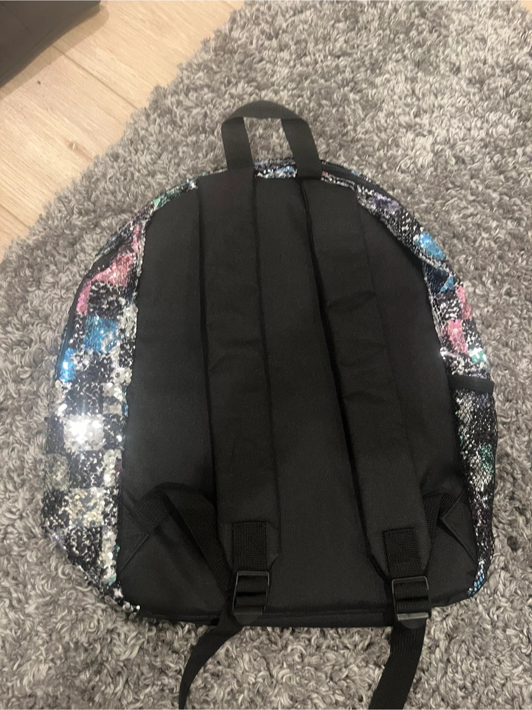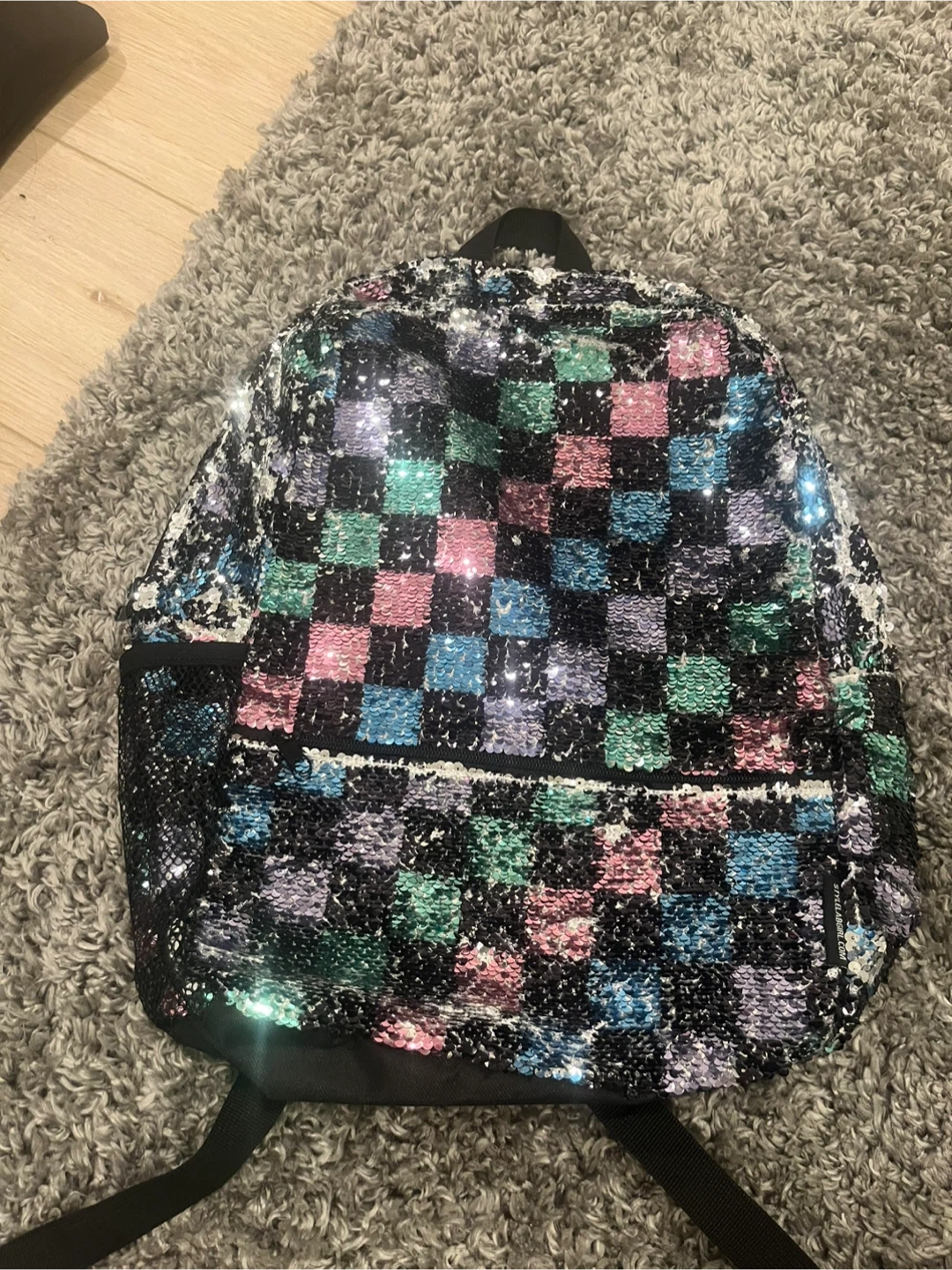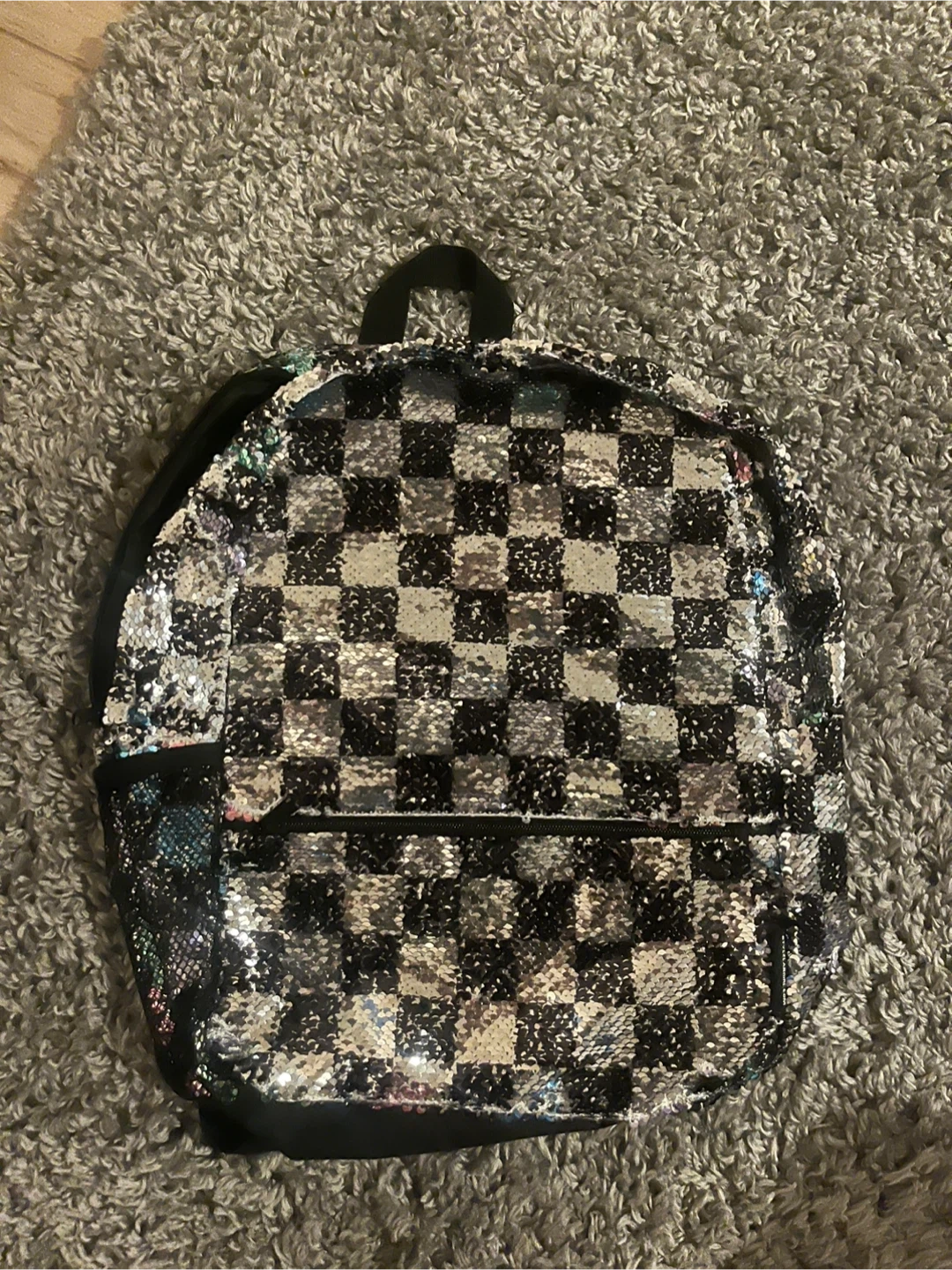 This backpack has a cool sequin checkerboard design! It features a main compartment and a front zippered pocket. It's perfect for school. Perfect condition barely used.