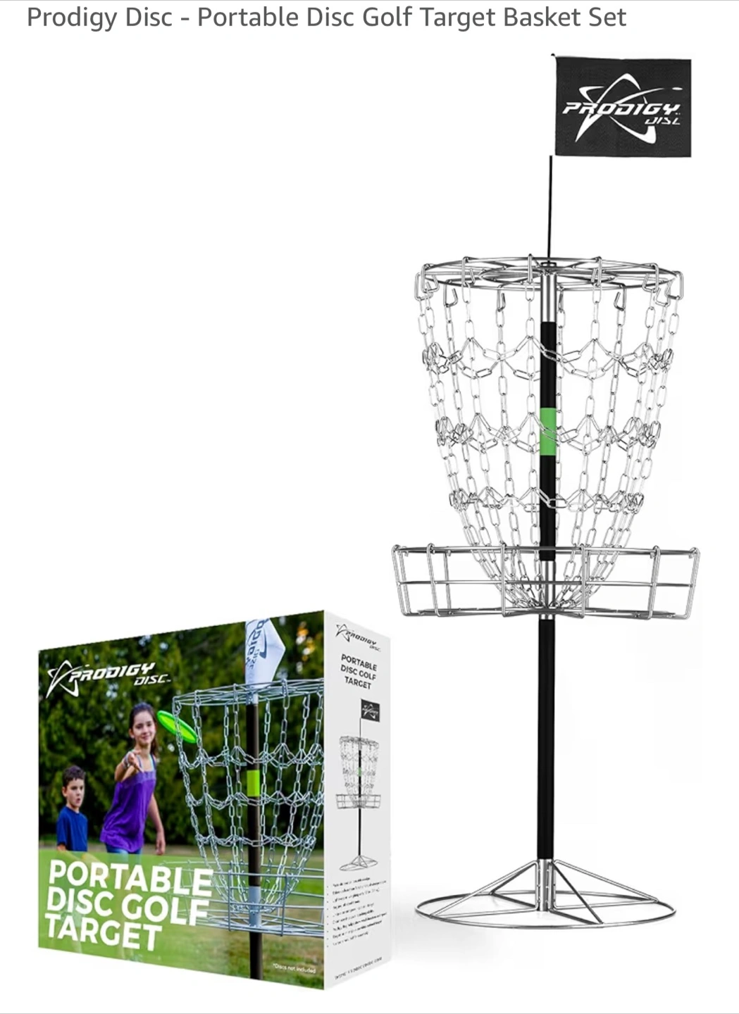 Never opened .This is a portable disc golf target from Prodigy Disc. It's lightweight, portable, and made with a durable steel frame. The target features a unique patent pending chain design. It's portable and collapsible, fitting into less than 2 cubic feet of storage space.