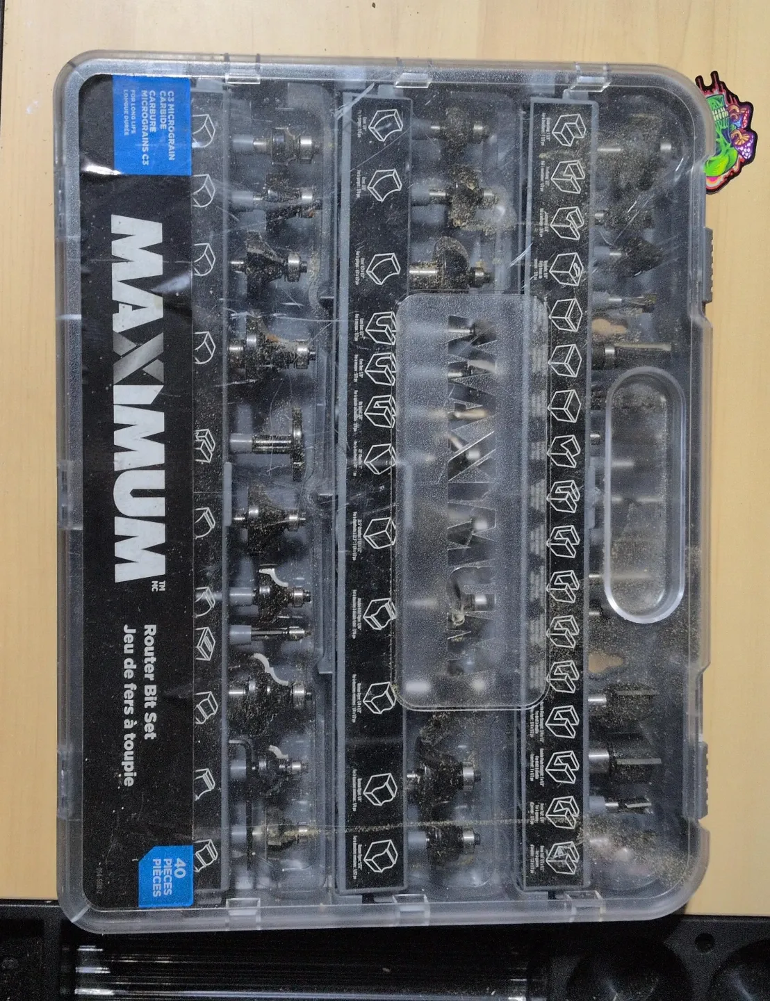 This is a MAXIMUM Router Bit Set with 40 pieces. The bits are made of C3 micrograin carbide for durability. These bits are designed for long life.