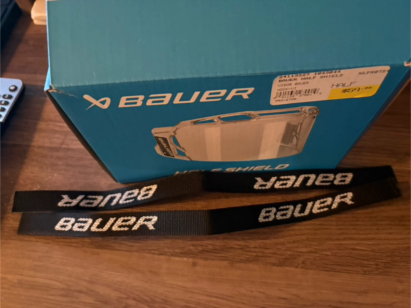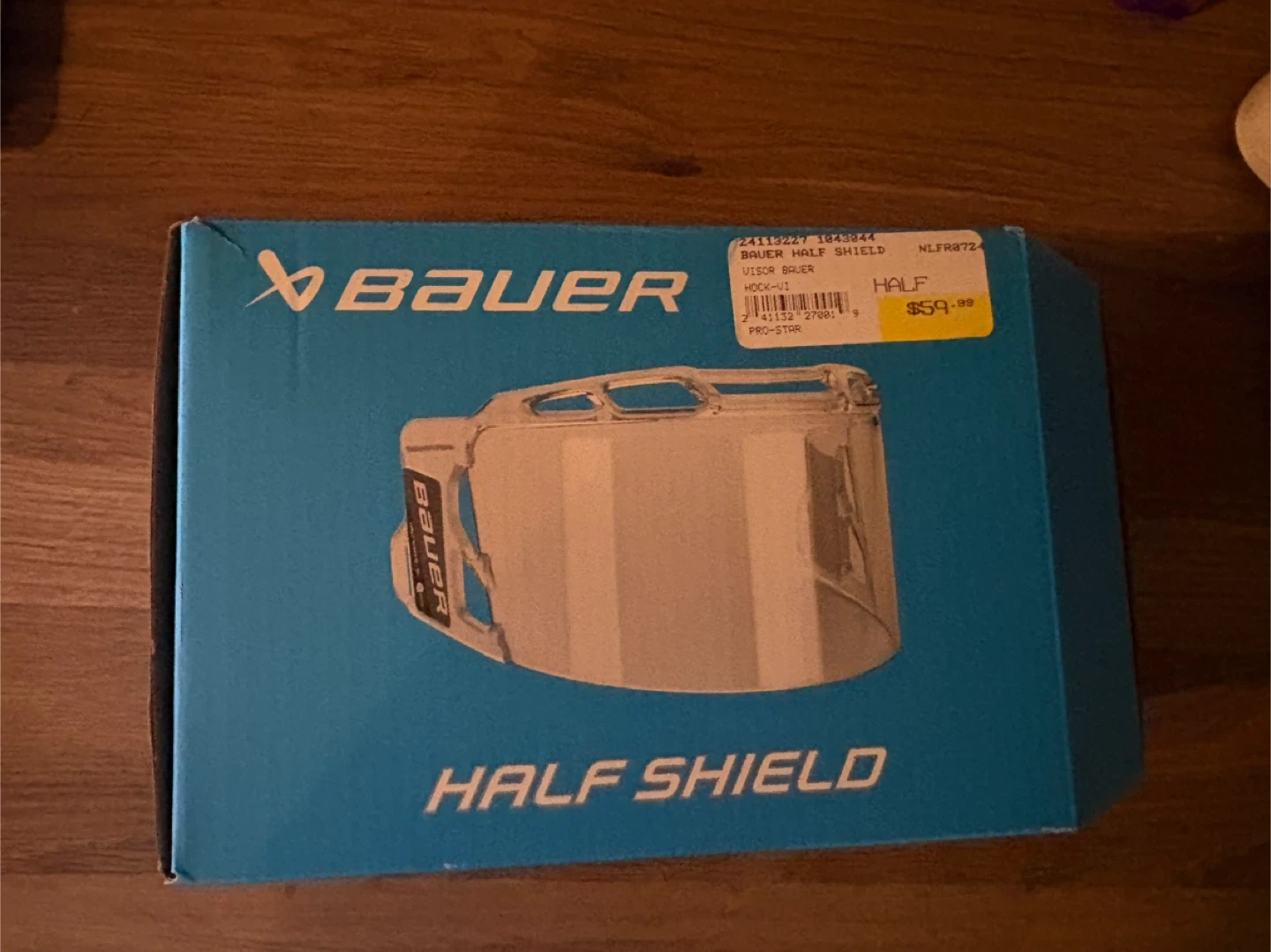 New Bauer Half Shield for hockey helmets. It comes with mounting hardware. This is great for players needing face protection on the ice!