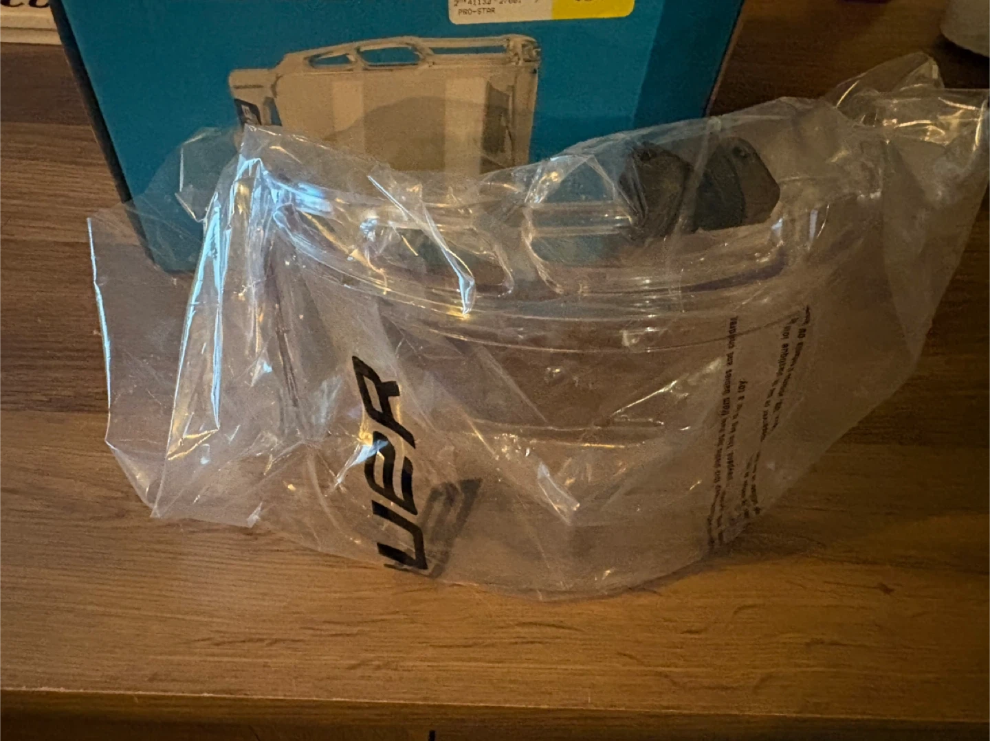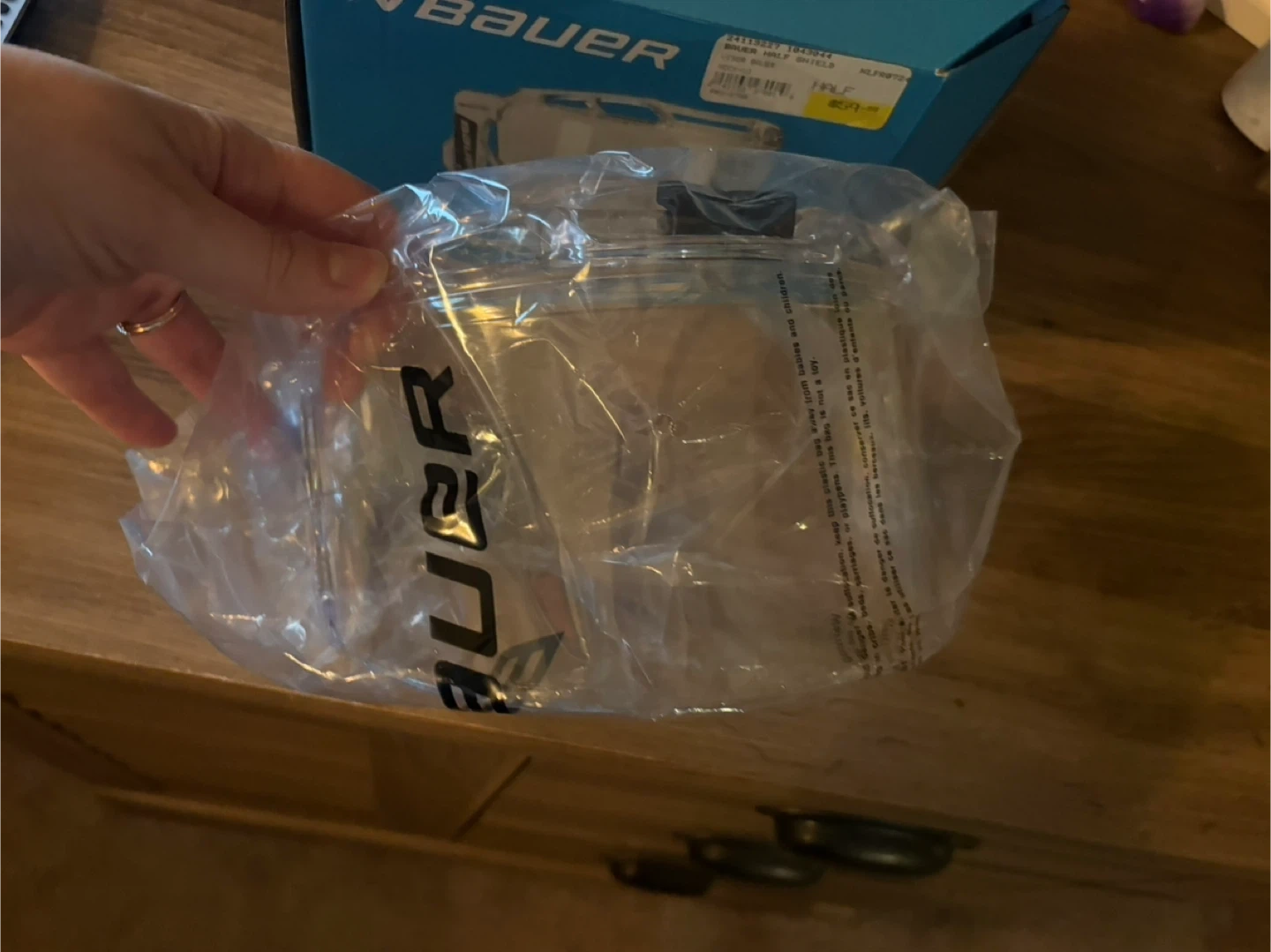 New Bauer Half Shield for hockey helmets. It comes with mounting hardware. This is great for players needing face protection on the ice!