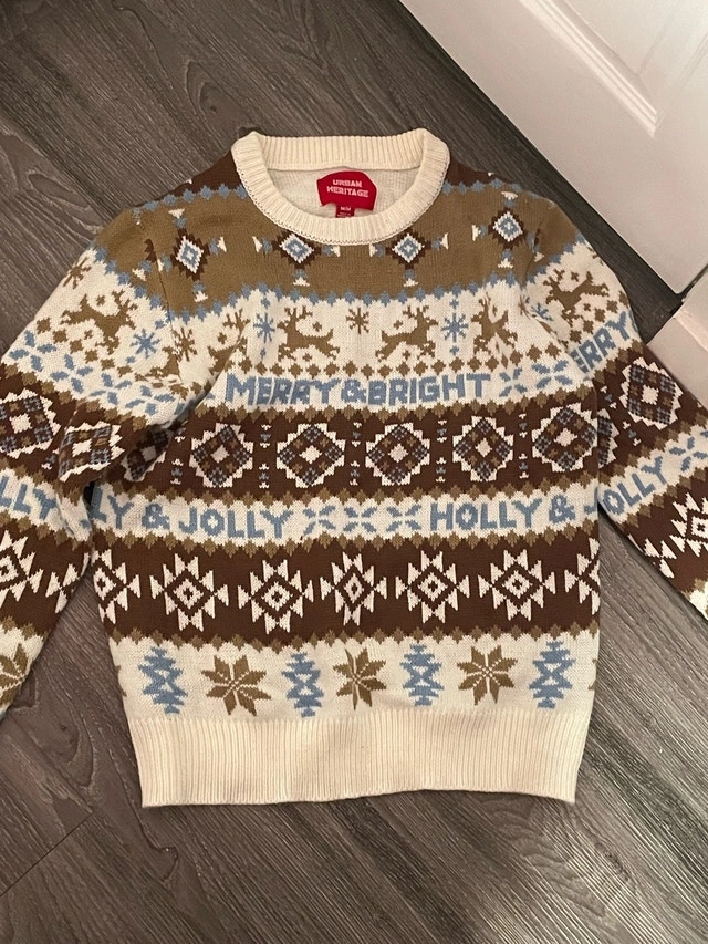 Get ready for the festive season with this gently worn Urban Heritage sweater, perfect for adding a touch of holiday cheer to any outfit. This sweater features a charming pattern with festive motifs, ensuring your little one looks stylish and feels cosy during those holiday gatherings. Brand: Urban Heritage. Size: M/M. This sweater is still available.